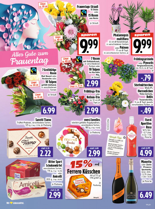 Bitte beachten Sie, dass dieser Text automatisch generiert wird und möglicherweise Fehler enthält5 Frauentags-Strauß As Ô ur 15 Stiele oder J 2 % L} 15 Rosen | © ‚> aus Kenia N H an u 1 14 8 (LE je Strauß Je # A & A Re = N a 7 En F 2 h sparen sparen { à Phalaenopsis cm CCE multiflora u 12 cm 9 Keramiktopf, Bi‘ ( KL in verschiedenen Farben À k oder Palmen 17 cm @ Topf, 8 in verschiedenen Sorten, je 1 Rosen Frühlingsprimeln Er | mit Schleierkraut, in verschiedenen oder Myosotis Farben oder Vergissmeinnicht, Es TX CA 10 Tulpen TMS im 10,5 cm 9 Topf, 71 Großblütige im Harlekin EN A je S Rosen Sie te MEER Red Naomi oder Mix, Avalanche oder je Strauß Be |, € 4 10 Tulpen | gefüllt blühend, ng! 35 cm Stiefmütterchen in verschiedenen Viola F1, Farben Frühlings-Trio Hornveilchen Läng je Strauß oder EN Viola Cornuta, ZEN Bellis 35 cm un) Nelken-Trio 7 im 3 cm ® Tausendschön, Si C Topf, je PR 9 cm @ Topf, jeweils verschiedene Farben, je } Ee” â Sarotti Tiamo merci lovelies À Itarol Trüffel-Pralinen, verschiedene Sorten, köstlich gefüllte Kugelpralinen, 125 g, (1kg= 17.76), je Packung verschiedene Sorten, Aperitivo 185 g, (1xg= 1616) Rosa Serviervorschlag » 14% Vol., je Packung 0,7 Liter, q APERITIVO (1 Liter = 7.13), Sanotti rok: Flasche m CI Weinglas zur iswûrfeln fun len, Häïfte mit velies Mit 60 ml ta Fel FrEL Ei sa, rol Aperitivo | 3 AMARETTO | und & ml Mineraiwasser rosecco | auffüllen, 2 Mit siner , rapefruit deus Scheibe ga mieren. ZARTSCHMEUZENDE TROFFEL MIT Al A =—— Ritter Sport Mionetto Le oder Zonin Ed Schokowürfel Prosecco verschiedene Sorten, 15 Sont % 176 g, kg = 16.99) Spumante, ee oder Ferrero Küsschen brut, DOC, 0,75 Liter, = Amicelli 44 g/172 g/ (1 Liter = 8.65) De es 178 g/267 q 200 g, (1 ka =14.95) RRERO je Flasche SCHEN je je Packung Packung LC AM 5 Dr 19 FAR Is Beispiel PR