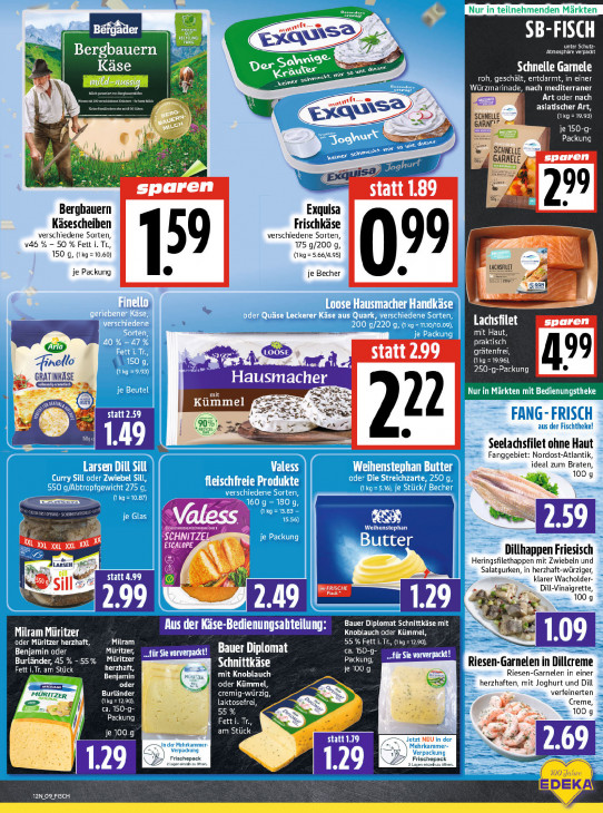 Bitte beachten Sie, dass dieser Text automatisch generiert wird und möglicherweise Fehler enthältB Nur in teilnehmenden Märkten ) Se N > EEN ed Ds we =, a a \ > SB-FISCH unter Schutz- Bergbauern #. LUNETTES (A ind Der S 3 Ner Schnelle Garnele Käse kr OU En u roh, geschält, entdarmt, in einer MATE PES ic, —_—— Dd Würzma rinade, nach mediterraner © en Arte be eh u = Art oder nach j Pre en ze aslatischer Art, WE z N NN SCHNELLE (kg = 19.93) EE EN 15 | je 150-g- Packung HNELLE ff iN sparen Zu CET Pe is EE 1, Er « ren statt 1.89 Bergbauern Exquisa Käsescheiben Frischkäse verschiedene Sorten, verschiedene Sorten, v46 % - 50 % Fett i. Tr., 175 g/200 9, 150 g, (1kg = 10.60) (kg = 5.66/4.95) ERSALET je Packung je Becher EE TE = N = sparen mit Haut, praktisch e=! grätenfrei, statt 299 TELL) 250-g-Packung sh Fa Nur in Märkten mit Bedienungstheke mi Ah, A = IS =, LR LS Ar Ze sud Seelachsfilet ohne Haut Fanggebiet: Nordost-Atlantik, ideal zum Braten, a, 100 y Leg: Pr M RÉ CE E KL Lon m ON se Dillhappen Friesisch LARSE! Heringsfilethappen mit Zwiebeln und Dill Salatgurken, in herzhaft-würziger, 8 klarer Wacholder- IS L (12 1 Ten Dill-Vinaigrette, Pack 4 100 g Bauer Diplomat Schnittkäse mit Milram Müritzer Knoblauch oder Kümmel, Milram Bew EAU: 1290), oder Müritzer herzhaft, >=} Benjamin oder Le Bauer Diplomat ca. 150-g- Burländer, 45 % -55% Müritzer Schnittkäse Packung, Riesen-Garnelen in Dillceme Fett i.Tr. am Stück herzhaft, if je 100 g Riesen-Garnelen in einer Benjamin mit Knoblauch CES oder Kümmel, © herzhaften, mit Joghurt und Dill AT. Burländer cremig-würzig, L x verfeinerten IGN arl laktosefrei, Creme, ca. 150-g- NE Packung 5% % = 100 9 Fett i. Ti 2 en * 5 je 100 g am Stück NEU A [= = lagen inzch zu non Frischepack Lagen enzeh zu öfnen. Frischepack Do EDEKA 12N 09 FISCH