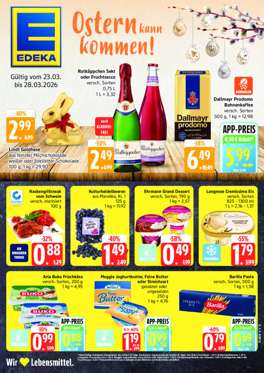 Bitte beachten Sie, dass dieser Text automatisch generiert wird und möglicherweise Fehler enthältà 2 in PL + > ENT Ed » ze ER | JA Rotkäppchen Sekt % Gültig vom 23.03 oder Fruchtsecco versch. Sorten f bis 28.03.2026 0,75 L à 1L=3,32 5 À Dallmayr Prodomo Bohnenkaffee U ” versch. Sorten 500 g, 1kg =12,98 L Dallmayr % sf prodomo A en APP-PREI LDH CELUI + 7 Lindt Goldhase Plhräppchen aus feinster Milchschokolade Polképpcher weißer oder Edelbitter-Schokolade pb] 100 g, 1 kg = 29,90 104 LS LE] en ill Nackengrillsteak Kulturheidelbeeren Ehrmann Grand Dessert Langnese Cremissimo Eis vom Schwein aus Marokko, Kl. I versch. Sorten, 190 g versch. Sorten versch. mariniert 125 9 1kg = 2,57 825 - 1300 ml 100g 1kg= 11,92 1L= 2,16 - 1,37 — _ < di ER Mein voumsot VANILLE Beeren ac 4 LT L 12 LS CL Arla Buko Frischkäse Meggle Joghurtbutter, Feine Butter Barilla Pasta versch. Sorten, 200 g oder Streichzart versch. Sorten, 500 g 1kg=4,95 gesalzen oder 1kg =1,58 ungesalzen ed 250 g GE 1kg=4,76 sem APP-PREIS APP-PREIS APP-PREIS CH CN TA | le Le | | ENEN] | el Sena | vd CH Yo cal LL 396 1kg: KR redhead D dr beer TEA EE OT AE EI ren m RZ L ge LEP AE RE RESTES CE