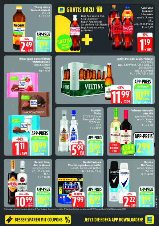 Bitte beachten Sie, dass dieser Text automatisch generiert wird und möglicherweise Fehler enthältThomy reines Coca-Cola Sonnenblumenöl E | Sl VITE Cola oder 750 m Limonade 1L=3,32 Beim Kauf von 4 x1,5 L versch. Sorten | Coca Cola mit der Weld Co TETE) r THOMY Sie die fünfte 1,5 L Flasche zzgl. 0,25 Pfand 1L=0,79 RENES (zzol. Pfand) nach Waht 'NENBLUMENÖ gratis dazu! APP-PREIS nr: 0,50 € Rabatt! | AT u aan À reg der APP Er Ritter Sport Bunte Vielfalt Veltins Pils oder Lager, Pilsener Tafelschokolade 20x0,5L versch. Sorten zzgl. 3,10 Pfand / 24 x 0,33 L / 100g B 24x0,275L 1Kg= 11,10 zzgl. 3,42 Pfand 1L=1,19 /1,51/1,81 di Le K UE te APP-PREIS (A PORT | Br LL ILE 100 € Rabatt! VELTI up iter, 112109 [138/166 PORT KAKAO-MOUSSE Puschkin IT Freixenet Mederaño Vodka oder Mia EE 37,5 % Vol. oder j spanischer Wein 100% Flavoured Vodka versch. Sorten 17,5 % Vol. 0,75 L 104 2 | (Yan 1L= 3,98 ON! 1L=8,55 Leschen) PUSCHEIN) | ALPEN MILC | APP-PREIS us! MEDERANO O2 € Rabatt NUE APP-PREIS APP-PREIS Ln 0,50 € Rabatt! Ie x 3 1,50 € 2 Le GESPART' RL 1Kg= 990 12) Bacardi Rum, Finish Maxipack Rexona Averna Amaro Maschinengeschirrspülmittel Deo Spray versch. Sorten, versch. Sorten und Größen versch. Sorten 27 - 37,5 % Vol. 42-64St./3kg 150 ml 7 0,7 L ROUE R 1L=14,80 1L=15,70 LIANG, BACARDÍ dv APP-PREIS TT APP-PREIS APP-PREIS 0,50 € Rabatt! RG (EEE i nl ‚kl B) 0 GA hr RE LI 1498 lg=./23 1L=1326 TRE Gleichzatig niedrigster Gesampreis der letzten 30 Tage. Niedrigster Gesamtpreis der letzten 30 Tage: Coca-Cola Cola oder Limonade: 1.29 €, Ritter Sport Bunte Vielfalt Taelschokolade: 1.29 € ANTENNEN E