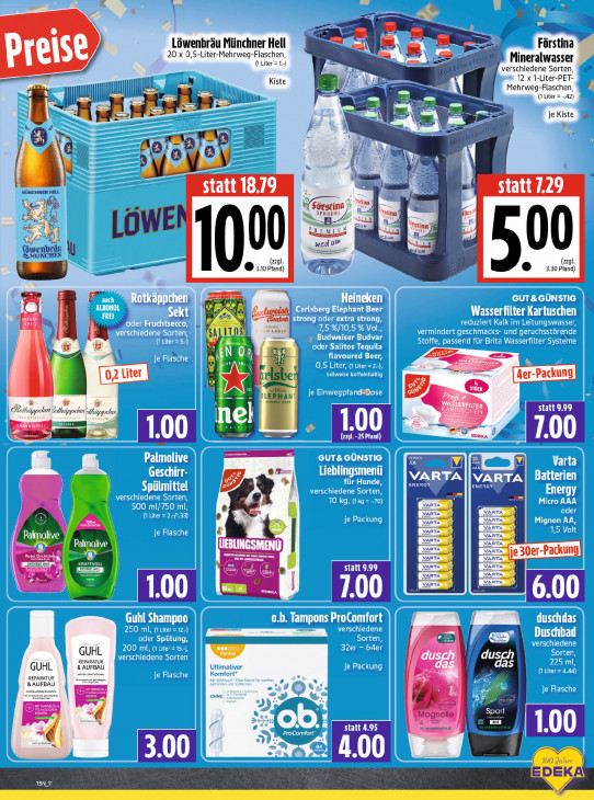 Bitte beachten Sie, dass dieser Text automatisch generiert wird und möglicherweise Fehler enthält—— ST ee Löwenbräu Münchner Hell Förstina 20 x 0,5-Liter-Mehrweg-Flaschen m. Mineralwasser (Liter =1.) verschiedene Sorten Preise Kiste 12 x 1-Liter-PET- Do À Mehrweg-Flaschen d u (IL dq (1 Liter = 42) À je Kiste == = (el ‘à 5 : MÜNCHNER HELL statt 18.79 L SEUL) 8 En: j a " ina 1 (scsi GE DE na LOWE Em Dy 00 : duw 00 {Owenbráu U (zzgl. (zzgl. 0 3.10 Pfand) 3.30 Pfand) ET ge LAGEN (4 © d {EN 0p Ber-Packung 1 | Dy Ach 117 | er tg) RN > ef Er EDEKA Mil; II y | Le ses Palmolive Palmalive WETTEN ano 1 e 30er-Packung [2 joLL B EE © Ge LE J u: ET. REPARATUR GUHL GUHL dusch REPARATUR & AUFBAU Sorel = agnolie E m 3% MRorIaam, EDEKA KEN)