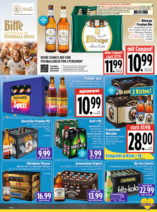 Bitte beachten Sie, dass dieser Text automatisch generiert wird und möglicherweise Fehler enthälta Eee es me u Beim Kauf von einer Kiste Bitburger Premium Bier, 20 x 0,5/24 x 0,33 Liter Ihrer Wahl, erhalten Sie 1 € Sofort-Rabalt gegen Vorlage dieses Original-Courons zusammen mit der Kiste direkt an À der Kasse. Dies enispricht einem Preis von 10.99 € je Kiste statt 11 99 € Keine Barauszahlung Li = teïnehmenden Markten und nur solange der Vorrat reicht möglich. Nicht mit anderen Aktionen kombinierbar. Nur in PARTNER DER MÄUNERNATIONALMANNSCHAFT 00 ge vom 07.bie 1. Apr 2026. IL III Il L 5 hz % Bitburger Premium Bier verschiedene Sorten, 1 20 x 0,5/24 x 0,33-Liter- Mehrweg-Flaschen Bi mit Coupon: (1 Liter = 110/1.39), 00 vo ohne Coupon: (1 Liter = 1.20/1.51) je Kiste Be, | » ali ri ae \ Carim men LATE ohne Coupon! hi RS \2 DEINE CHANCE AUF EINE 110 71. 0 FUSSBALLREISE FÜR 2 PERSONEN* 4 99 m SCANNEN Bitte beachte die Teilnahmebedingungen UND MEHR Teilnehmeschluss ist der 13.04.2026. und Datenschutzhinweise der Aktion; (zzgl. 3.107 ERFAHREN bitburger de/ektinen‘wrr/verlosung-edeka (zal. 9 0° 3.42 Pfand) © 3.42 Pfand) h ss N gi r autaner ;pezi | sa | = PURE, Bi ELA sparen IT PAULANER LANERPAULANER + N (2 ® CE 99 X BIT $ 0 © 05 \ € \ N k \ M ur | S > statt 4198 ON (OC ! EE ZA a = À | D ki X ER ale pn 00 N (dl. geerde: RE statt 17.79 NT BE 6 6.20 Pfand) LL 5 9.99 2 Erb er l ich =11- (zzgl.3.10/3.42Pfand) (zzgl—48 Pfand) tspric it je Ki (zzgl. 3.10 Pfand) lenrweg- Original Ele Du Eng: Het LT. LT à 7 : / == N nn Kel statt 28.99 Sürtebeler QU ee Le DN statt 17.99 aA 22.99 GRAN Einzelflasche (UT) ‚2 Pfand) statt 1. 716.99 13.99 (1 Liter 6) (2291.3.10 Pfand) (æyl.2.18/3.10 Pfand) E72 8 Pfand Bde ee SSL.