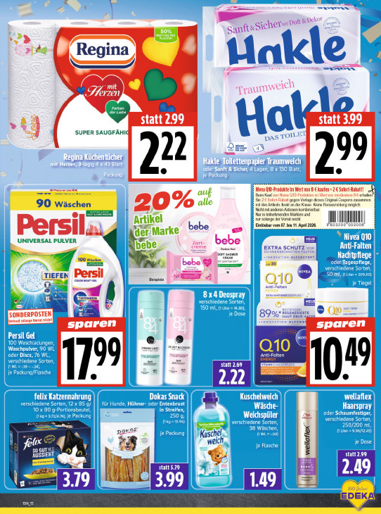 Bitte beachten Sie, dass dieser Text automatisch generiert wird und möglicherweise Fehler enthältmezen = RECYCEL 50% 2 PLASTIK" de à Regina 4 == mit 12441) RL 00 os der Liebe CAA 99 statt 309 SUPER SAUGFÄHIG pemeeeneenveereee nn en ivea Q10-Produkte im Wert von 8 € kaufen = 2 € Sofort-Rabatt! ei Kauf von Nivea Q10-Produkten im Wert vor mindestens 8€ erhallet it den Artikeln direkt an der Kasse Keine Rarauszahlung möglich ic 2 Sofort-Rabatt gegen Vorlage dieses Original-Goupons zusammer 90 20 icht mit anderen Aktionen kombinierbar. KA En rin teilnehmenden Märkten und ır solange der Vorrat reicht. | Il I | Artikel lösbar vom 07. bis 11. April 2026. 9 823200 002008 | NE bebe en Na ne NN | x Pers der: Marke UNIVERSAL PULVER bebe. Trocken Ing SOFT SHOWER CREAM Ss ir. + 8 ED Bersil -OLOR K Beispiele aio À Ben Do LTIEFENSE [e m &» go Ss ONDERPOSTEN Oo #15 ‚Verkauf solange Vorrat reicht! nn sparen sparen (FRESH LIME] vey | en sen in = 4h ze aur fl u s | ñ F en goras A Kuschel weit fe 17 SRE 2} 29 wellaflex N AUSS Mi () || + A al L a Ai EDEKA 15N15
