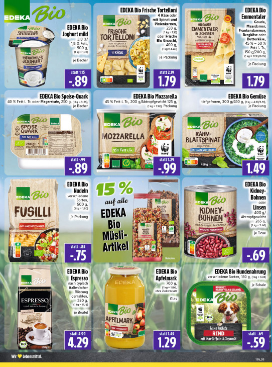 Bitte beachten Sie, dass dieser Text automatisch generiert wird und möglicherweise Fehler enthältEEE ar £ Jia ? 9 EDEKA ER Frische Tortelloni EDEKA Bio DO 4 Käse oder 14, Emmentaler ’ U mit Spinat und ot OS MZ Pinienkernen ALLGÄUER Gouda, u EDEKA Bio 250 g, Maasdamer, WEIDEMILCH OGH (1 kg = 7.16) EMMENTALER IN SCHEIBEN Frankendammer, TE Joghurt mild oder Frische 45% Fett ir. Bergkäse oder 3,8 %/ TORTELLONI Bio Gnocchi, mi Rohmich nergostelt Butterkäse, 1,8 % Fett, nicht vorgshocht & 400 g, MENT 45% 50 % 500 g, sema Zioeretlng / A (1 kg = 4.48) EL Fett i. Tr. (1 kg =1.78) Ÿ . 150 g/200 g, CH ; POREN ( kg = 11.93/8.95) WEIDEMIL Ti je Becher je Packung G je Packung ett. mild. ci x & statt 1.15 ST & statt 2.19 WWE Ee Haltungs- Fr = = rm Lo AL 1.19 KEN EDEKA Bio Speise-Quark EDEKA Bio Mozzarella EDEKA Bio Gemüse 40 % Fett i. Tr. oder Magerstufe, 250 g, {1ky =3.56) 45 % Fett i. Tr., 200 g/Abtropfgewicht 125 g, tiefgefroren, 300 g/450 g, (1 ko = 4.97/3.31), je Becher = + {kg=7.92), Packung je Packung Bi PLA je om z A Ë >. 2 SPEISE- 4 O ae. ada te Pe RAH MOZZARELLA 4 A 250g BLATTSPINAT eg Sing ve is a ee, ‘tefgefronen à m N TRE Ara Ju II WWE Rein sodat Aj BEER LT] statt 1.29 450ge tk, - 99 EDEKA Bio EDEKA Bio Nudeln O verschiedene = Kidney- m ou Bohnen Sorten In [LAS oder 500 g, auf alle USPER (1kg =1.50) Sa be su i Linsen À iOKO KIDNEY- 400 g/ FUSILLI je Packung EDEKA ER = Abtropfgewicht ei BOHNEN FF 265 g, 10 mld-nussiger besstmack 4 = (1 kg = 2.60) hem {2 KNUSPER MUSLI LOT TETE 2 zu BEEREN le je Dose € sl |= a 1 La nf) Pi,‘ V4 Pi # A Ri Art kel è A Ci ER ter y HE 2 Ze Di nd au = zar en EDEKA Bio EDEKA Bio EDEKA Bio Hundenahrung verschiedene Sorten, 150 g, (1kg= 3.93) Espresso Apfelmark nach typisch À 700 9, je Schale PE | italienischer ohne Zuckerzusatz (kg =1.84) Eus KARTOFFELN & SESAM Röstung gemahlen, 73 ESPRESSO Ne 250 9, Glas LA CO (1 kg= 17.16) gemahlen me je Beutel nn nur a er Bio’ a APFELMARK/ Ik Feine Pastete ©, Beuel] Ta statt 1.45 statt -.69 en RIND mit Kartoffeln & Sesamöl © 25096 | MR VAN 59 kn Wir ® Lehensmittel 15N_08