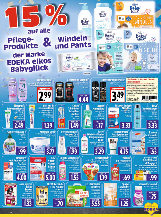 Bitte beachten Sie, dass dieser Text automatisch generiert wird und möglicherweise Fehler enthältIk B : likt 0; Babuÿ Gl © Os Ge PREMIUM 5 Bab Glück WINDELN 1 sum 18 elkos auf alle a elkos 2 Bab Glück 368 pflege- windeln 5 & aen produkte und Pants & ke der Marke Ki Lich 3 Ge ? qe EDEKA elkos 12 ® EDEKA Æ EDEK/ Beispiele poat dd Bayon = cm 2 Bxe-Produkte im Wert von 8 € kaufen = Se abatt! ES vs Doppel inde 2 Prat er Mai im Wert vo en € rh Se : er sparen { CE / CE ba AXE sparen 2 €Sofor-Rebalt gegen Vorlage diese: kein direk an der Kasse Ke icht mit anderen, statt 5.29 ey der Vorrat rei near Nurintelnehenten Märkten und ur solange bau pm Ei er | 823230 a 022007 ul | bis 18. April 2026. 4 III] | = 3 1 Kukident & = or: HAMPO SENSODYNE D ET Ì F ee en 3 il IE a = = sr BUL Doe | “ 7 Sl AL pe "4 HiPi nn 8 INTENSE MIGH PAICH statt 4.99 PT statt 5.99 N BI S D 4.00 69 | ® SAFTIGE BROCKEN BE LLS 2 ese EE 125 Kd