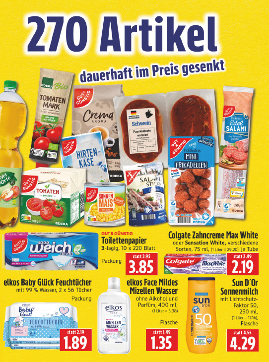 Bitte beachten Sie, dass dieser Text automatisch generiert wird und möglicherweise Fehler enthält210 Artikel dauerhaft im Preis gesenkt = Ln Bro TOMATEN 2-Pa Beh konzentriert ROUTE us oars Delikat Ee Cr ROMA San ( SALAMI Nei —papitasteals | > Er Be NUS Tp dele Wi RIEN ER NI ve GA, N. is ASE ho Br FRIKADELLEN = EDEKA 4 Le Nid aka Se jr AZ 2 SALAM) Ü VON == STI hj passiert ro mA 56 650g€ EDEKA "| 1 I || FL SO 00ge iel 1 ir EDEKA e= Due LT) Colgate Zahncreme Max White Toilettenpapier oder Sensation White, verschiedene a 3-lagig, 10 x 220 Blatt Sorten, 75 ml (1 Liter = 29.20), je Tube en A CI. Packung ==. MaxWhite dl ma. elkos Baby Glück Feuchtücher elkos Face Mildes Sun D'Or mit 99 % Wasser, 2 x 56 Tücher Mizellen Wasser Sonnenmilch ohne Alkohol und clko: Packung sun mit Lichtschutz- elkos II Parfüm, 400 ml, Faktor 50, ©. (1 Liter = 3.38) 250 ml, ES ES (1 Liter = 17.16), Bra Flasche Flasche SER {| A A Ë D'OR ® 5 ‚vera sh