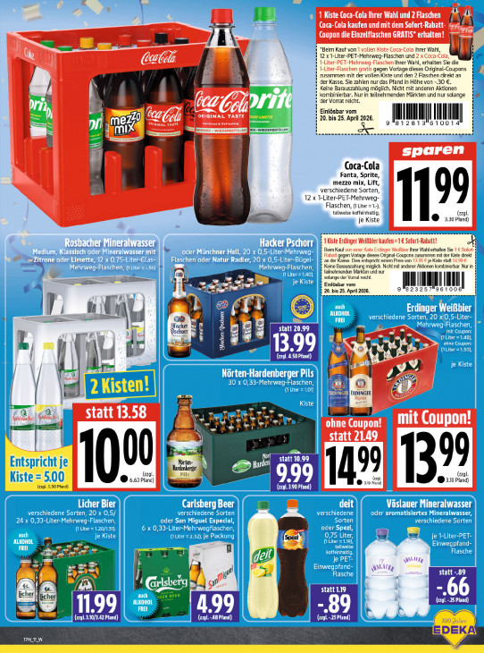 Bitte beachten Sie, dass dieser Text automatisch generiert wird und möglicherweise Fehler enthält1 Kiste Coca-Cola Ihrer Wahl und 2 Flaschen Coca-Cola kaufen und mit dem Sofort-Rabatt Coupon die Einzelflaschen GRATIS* erhalten! a “Beim Kauf von 1 vollen Kiste Coca-Cola Ihrer Wahl, ! 12 x1-Liter-PET-Mehrweg-Flaschen und 2 x Coca-Cola 6 GOA 1-Liter-PET-Mehrweg-Flaschen Ihrer Wahl, erhalten Sie die 1-Liter-Flaschen gratis gegen Vorlage dieses Original-Coupons , zusammen mit der vollen Kiste und den 2 Flaschen direkt an der Kasse. Sie zahlen nur das Pfand in Höhe von -.30 € 1 Press Keine Barauszahlung möglich. Nicht mit anderen Aktionen iS kombinierbar. Nur in teilnehmenden Märkten und nur solange Vort Einlösbar vom A) CZ, 20. bis 25. April 2026. „MIN Il Il r Delicious & Re 1 2813 610014 | veg -WIEDERBEFOLUW 1 EE RE " u sparen A 3 Coca-Cola Fanta, Sprite, | mezzo mix, Lift, verschiedene Sorten, pn 12 x 1-Liter-PET-Mehrweg- 99 Flaschen, (1 Liter =1.-) teilweise koffeinhaltig, {gl je Kiste 3.30 Pfand) EE mr nn er à 1 Kiste Erdinger Weißbier kaufen =1€ Sofort-Rabatt! Lef À Eee ı Beim Kauf von einer Kiste Erdinger Weißbier Ihrer Wahl erhalten Sie 1 € Sof 1 Rabatt gegen Vorlage dieses Original-Coupons zusammen mit der Kiste direkt : ï an der Kasse. Dies entspricht einem Preis von 13.99 € je Kiste statt 14 99 € ı Keine Barauszahlung möglich. Nicht mit anderen Aktionen kombinierbar. Nur in teilnehmenden Märkten und nur 3 es solange der Vorral reicht Ee Au el Eu Einlôsbar vom I I | = SL ll 257 9610 20. bis 25. April 2026. EE | 11 ir tlg u dl g- = schort cher sn ac att 20.99 à Kost & Pac x à Sfacker-Dschore 13,99 © a (7291. 4.50 Pfand) Je Ì Ÿ N CE SELS Resch ls PD Nörten-Hardenberger ad © bee. INGER ce Ge ER statt 13.58 Na du HE LA 7 Lu LATE = | | es ji ohne Coupon! statt 21.49 = | statt 10.99 tje 00 Nörten- 5 99 &D Harden 99 A (zzol. 7 Hardenberger (zzgl. ! 5 U U 0 6.60 Pfand) 999 A fa 3 ©® 3.0 Paro) (an. 0 Pfand) (ay 90 Pfand) © 21020) Dei LICher | AE J n Jer MAMA EIRE ve # san Miguel CLS lebet Lu} hk dd PE: ED nen ee y a “ | ed ne = H RNN | ASE statt „89 BR W | A ma ige statt 1.19 er BEER 66 rt, (zzol. 25 Pfand) Pe RE m 99 44 199 89 a (zy1.3.10/3.42 Pfand) (zzgl A8 Pfand) (api and) 0 ee