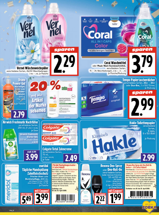Bitte beachten Sie, dass dieser Text automatisch generiert wird und möglicherweise Fehler enthälta Le SE ALLE Kirdersicherer Versen Frische Zum Ötnen Sauber 4 & Frisch Wildrose NT CT f m Se 9) sparen Für alle farbigen Textilien* sparen m \50/ Go wac wie Coral Waschmittel oder Magic Wash Kurzwaschmittel, Vernel Wäscheweichspüler verschiedene Sorten 15 - 26 Waschladungen, G wi =-15 - -25) verschiedene Sorten, 46/50 Waschladungen (wr = 05), je Flasche je Flasche/Packung Am a 20 | % sebamel sparen (in Sebamed SEIFENFREIES © F WASCHSTÜCK Be. ak 2m Vitamin E am GR & < (A haurerLece Ÿ Bee ie | A T 5 y dr & — Free D Colgate EN Olan river schor Colgate 5 u a 8 PS 3 y Le À Le j u y = PE EE" NN 32 Meridol Mundspilungen kaufen 4 1Rexona Deo-Spray oder Deo-Roll-On \ 53 € Sofort-Rabatt! kaufen=-.23 €Sofort-Rabatt! [ Beem Kauf von 2 Meridol Mundspülungen Beim Kaut von 1 Dose/Stück Rexona Deo-Spray { rer Wahl, erhalten Sie 3€ Sofort- ‚oder Dev-Rul-On der genannlen Sorlen Ihrer Wahl, 4 1 Rabatt gegen Vorlage dieses Rexona ethalton Sio 23 € So'ort Rabatt gegon Vorlage i Original. Coupons zusammen mit den dieses Orginal-Coupcns zusammen mit der Dose/ f 1 Flaschen direkt an der Kasse. Keine dem Stück direkt an der Kasse. Dies entsprich! A 1 Barauszahlung möglich. Nicht mit einem Preis von 1.99 £ je Dose/Stück statt 2.22 €. 0 „anderen Aktionen kombinierbar. Nur n teilnehmenden Märkten und nur ‚Aktionen kombinierbar. Nur in teilnehmenden Keine Barauszahlung möglich. Nicht mit anderen BT lle = 1 solange der Vorrat reicht 7 Einlösbar vom Märkten und nur solange der Vorrat reicht. # Einlösbar vom 20. bis 25. April 2026. 1 mit Coupon! 20. bis 25. April 2026. mit Coupon u ELC ohne Coupon! Il QUIL LI 256 2502 INE III P dd nnn | 23200 383008 ne ENNE eee 22 EDEKA LARE)