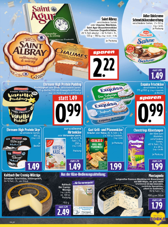 Bitte beachten Sie, dass dieser Text automatisch generiert wird und möglicherweise Fehler enthältam Adler Edelcreme Saint Albray verschiedene Sorten Schmelzkäsezubereitung verschiedene Sorten, 2x 50.g, oder Chaumes Weichkäse, (1 kg = 14.90), Saint Agur Blauschimmelkäse je Packung oder Chavroux Ziegenfrischkäse, 20 % Fett absolut - 62 % Fett i. Tr., ig & cremig 125 g — 180 g, (1kg =12.33 — 17.76) EDELCREME ig Iküse aus Frankreich je Packung Sa jure En al ag Ee AINT we LS > 4) = LBRAY, LonD, paren de TA - À vo ri mA Uzi, IN N Au NDOUE ES gij & wo, on S uvre u. EE statt1.99 SA y ALB 1.49 sG Kalle an Re sa F Ke La Se HIGH PROTEIN CE D Vata ia EIS : statt 1.49 | sparen Puddiug mt te NN Ehrmann) LE hu LA Cp A dee Ps N Url Era (T7 wg jk EU = Ehrmann High Pi LR Gazi oi (ALT Le ATOUT Ih (asesta gen [01 = À nirtenkase MESA Een ART U Pre AS GAZ es il = ie © m ur A Mozzarella Area a r a %; N hi “3 N AAD 7 à OTHER] NIE I IN Reg 4 ee A 25096 mpækA > Ei 1.49 u KEE Kaltbach Der Cremig-Würzige Aus der Kise-Bedienungsabteilung: Montagnolo Schweizer Schnittk höhlengereift, 56 % Fett i.Tr., am Stück kaltgereifter Premium-Weichkäse mit Blauschimmel für Sie vorverpackt! aus dem Allgäu, der grau-weiße Kaltbach old Urschimmel ist das bésondere, Der Cremig- natürliche Kennzeichen, Würzige e\ I pikant im Geschmack, rik Ac IA {kg = 24.90), ca. 120-g- y 100 gam Stück Packung Q SI statt 2.49 100 5 statt 3.29 er 119 ER Frischepack 2.49 2 2 Lagen einzeln zu öfnen. 106 DEKA