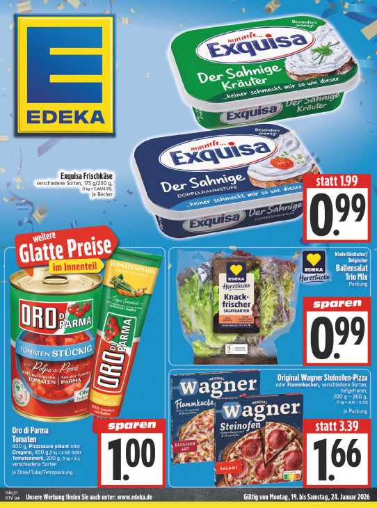 Bitte beachten Sie, dass dieser Text automatisch generiert wird und möglicherweise Fehler enthält| dd. + mm ASS LA ERS EE per SAME or CA Kräuter EDEKA ‘ae Besonders CP mm ERS NS Exquisa Frischkäse verschiedene Sorten, 175 g/200 g, BI ve “statt 199 (kg = 5.66/4.95), Sas je Becher oeren nige =) en Ee AU „= EC Preise = im Innenteil 7: ed KA EDEKA Herzstück Herzslücke Hil Knack 4 frischer sparen SALBTSARTEN u ÜRD AR | N rl 5 2 er ATEN STUÜCKIC LE war Aus dar Pro 11 OMATEN | FAR za SI D ES Zuckef# liens Flommkuche, m El IT MT pn Ÿ er sE sparen IR Steinofen statt 3.39 Dro di Parma LÉ ELSÄSSER CA) AÛ hk Ara elie) SALAMI Kw oa Unsere Werbung finden Sie auch unter: www.edeka.de Gültig von Montag, 19. bis Samstag, 24. Januar 2026