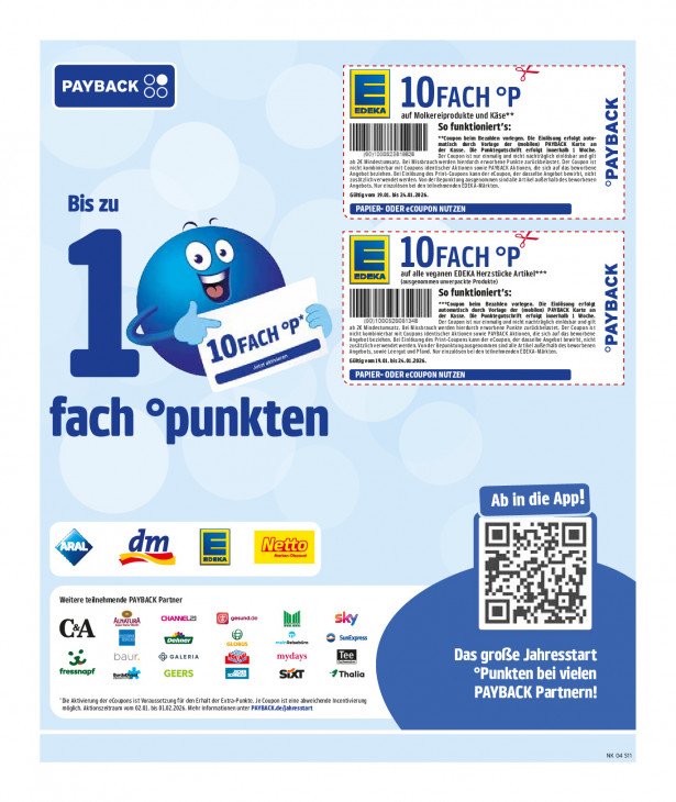 Bitte beachten Sie, dass dieser Text automatisch generiert wird und möglicherweise Fehler enthältEn ee EEE PAYBACK 98 10racH op auf Molkereiprodukte und Käse** 5 So funktioniert's: **Coupon beim Bezahlen vorlegen. Die Einlösung erfolgt auto- matisch durch Vorlage der (mobilen) PAYBÄCK Karte an IM Il der Kasse. Die Punktegutschrft es innerhalb 1 Woche. ii 110005238 tesa Der Coupon ist nur einmalig und nicht nachträglich einlösbar und gilt ab 2E Mindestumsatz. Bei Missbrauch werden hierdurch erworbene Punkte zurückbelastet. Der Coupon ist nicht kombinierbar mit Coupons identischer Aktionen sowie PAYBACK Aktionen, die sich auf das bemorbene Angebot beziehen. Bei Einlösung des Print-Coupons kann der eCoupon, der dasselbe Angebot benirbt, nicht zusätzlichverwendet werden. Von der Bepunktung ausgenommen sindalle Artikel außerhalb.des beworbenen Angebots. Nur einzulösen bei den teilnehmenden EDEKA-Härkten. 5 Gültigvom 19.01. bis 24.01.2026. Bis zu PAPIER- ODER eCOUPON NUTZEN en a m a bennen 0.4 Be = = = kid m 10FacH pP ‚auf alle veganen EDEKA Herzstücke Artikel*** (ausgenommen unverpackte Produkte) 5 So funktioniert's: **coupon beim Bezahlen vorlegen. Die Einlösung erfolgt automatisch durch Vorlage der (mobilen) PAYBACK Karte an mM der Kasse. Die Punktegutschrift erfolgt innerhalb 1 Woche. B 190)100082808 1348 Der Coupon ist nur einmalig und niche nachtréglich einlésbar und gilt 1 ab 2€ Mindestumsatz, Bei Missbrauch werden hierdurch ermorbene Punkte zurückbelastet. Der Coupon st €) nicht kombinierbar mit Coupons identischer Aktionen sowie PAYBACK Aktionen, die sich auf das beworbene Angebot beziehen. Bei Einlösung des Print-Coupons kann der eCoupon, der dasselbe Angebot bewirbt, nicht zusätzlichverwendet werden. Vonder Bepunktungausgenommen sindalle Artikel außerhalb des beworbenen F Angebots, sowie Leergut und Pfand, Nur einzulösen bei den teinehmenden EDEKA-Härkten. yon Gültig vom 19.01. bis 24.01.2026. PAPIER- ODER eCOUPON NUTZEN ss nn m Änuu nun u Sn a nun ch °punkten Ab in die QE lis [=] el du E Weitere teilnehmende PAYBACK Partner 2 ALIATURE awazı (G) oesmace Sie IM ( sky El CA © m E en sLoBus meinfeisebûro 85 SunExpress e . baur. © causa sa En mydays Das große Jahresstart fressnapf nie GEERS SXT Thalia °Punkten bei vielen PAYBACK Partnern! “Die Aktivierung der eCoupons ist Voraussetzung für den Erhalt der Extra-Punkte. Je Coupon it ine abweichende Incentivierung möglich. Aktionszeitraum vom 02.01. bis 01.02.2026. Mehr Informationen unter PAYBACK.de/jahresstart NK 04 ST