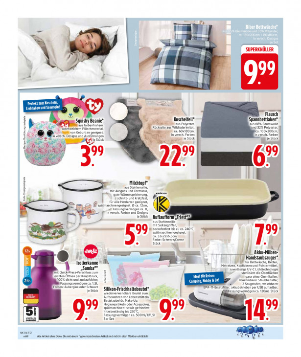 Bitte beachten Sie, dass dieser Text automatisch generiert wird und möglicherweise Fehler enthältR- = = SUPERKNULLER TT bi DL = Perfekt zum Kuscheln, Sr Liebhaben und Sammeln! ty Flausch Kuschelfell* Spannbettlaken Squishy Beanie _< aus Polyester, aus 68% Baumwolle Le aus farbenfrohem, Rückseite aus Wildlederimitat, und 32% Polyester, x an Plüschmaterial, 598 von Geburt an geeignet, ca. 60x180cm, ca. 100x200cm, ©. versch. Designs und Ausführungen in versch. Farben in versch. Farben = Stück je Stück je Stück u RP a? pass pn Design-/Austührungsbeispiele x “| - * A 99 „99 ® 22? a + Milchtopf* aus Stahlemaille, gr mit Ausguss und Literskala, 1| sr gute Wärmespeicherung, KRÜGER 1 } schnitt- und kratzfest, 7 Farb-/Designbeispiele für alle Herdarten geeignet, Es pümes. chinengeeignet, @ ca. 12cm, = Fassungsvermögen ca. Il (Fin versch. Farben und Designs je Stück Auflaufform „Triest ss aus Stahlemaille mit Seitengriffen, F — we backofenfest bis zu ca. 240°C, st 199; spülmaschinengeeignet, ca. 32x22x6,5cm, Farbe: Schwarz/Creme 5» Stück w ML: { Akku- fe e © Handstaubsauger* Isolierkanne = a TV für Bettwäsche, Betten, Matratzen, Kopfkissen und Polstermöbel, „samba”* zuverlä ster UV-C Lichttechnologie iert die Oberfli hen mit À Press-Verschluss zum leichten Öffnen per Knopfdruck, Ideal für Reisen ganz ohne Chemikalien, 100% dicht und auslaufsicher, ohne Inhalt a Camping, Hobby & Co! abnehmbarer Staubbehälter, Fassungsvermögen ca. 1,5l 2 Saugstufen, waschbarer Farben: Aubergine oder Schwarz EPA-N-Ersatzlilter, akkubetrieben per USB aufladbar, je Stück Silikon-Frischhaltebeutel* wiederverwendbare Beutel zum Fassungsvermögen ca. 120ml, Stück zn Aufbewahren von Lebensmitteln, Fe 7 Bastelzubehör, Make-Up, Hygieneartikeln oder Accessoires, spülmaschinen- sowie gefrierfest, 99 99; hitzebeständig bis 220°C, Fassungsvermögen ca. 500mI/11/1,51 a i 9” 3er Set NK 04 si2 mNF Alle Artikel ohne Deko. Die mit einem * gekennzeichneten Artikel sind richt in allen Märkten erhältich!