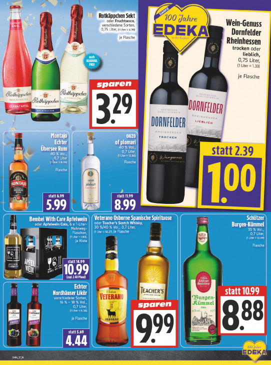 Bitte beachten Sie, dass dieser Text automatisch generiert wird und möglicherweise Fehler enthält& Rotkäppchen Sekt oder Fruchtsecco, 100 Jahre 0,75 Liter, (1 Liter = 4.29) verschiedene Sorten, Wein-Genuss EDEKA Dornfelder je Flasche Rheinhessen trocken oder lieblich, 0,75 Liter, ne (1 Liter = 1,33) I je Flasche sparen © S dln hen m Ptit (1150 O2 Weäppehen Tg | DORNFEIDER LIEBLICH DORNFELDER plu) |1) Ald TROCKEN AA LL 9 - le är A 2% statt 2.39 ax 55 ON olizo UT] pie ÜBERSEE statt 6.99 statt 11.99 ee XLR Li SI 1 [10 Schlitzer hs LU EU 2 5 ans FE > API Il A) statt 14.99 FLN FF ou \ e (azol. 2.40 Pfand) Pics estillecie 6 Fe Au Calera TEACHER'S statt 10.99 er VETERAN( sparen 88 ns — SED = statt 5.69 4.44 106 ONW a
