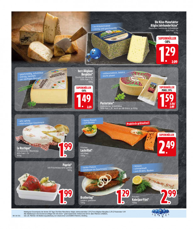 Bitte beachten Sie, dass dieser Text automatisch generiert wird und möglicherweise Fehler enthältDie Käse-Manufaktur ke Allgäu Jahrhundertkäse* x Deutscher, halbfester Schnittkäse 50% Fett 1. Tr. Bes 1009 we nn LES SUPERKNÜLLER bh 38% \ = Sa 29 5 Paid ACE a Bergkäse* Deutscher Hartkäse = er: 50% Fett i. Tr. Ze -- Koef # RE Dm SUPERKNÜLLER MIND. 29% A en EEE 59 SE a JL 0 Italienischer Schnittkäse L dn AE SEA er 229 50% Fett i. Tr., auch als SB-Stück, je 100g ES. a Praktisch grätenfrei 5 In SUPERKNÜLLER > a EN EL TT TC É 99 Frisches ul) Französischer Weichkäse Lachsfilet* 45% Fett i. Tr. mit Haut LU CR Paprini* mit Frischkäsecreme gefüllt, LUN BEE zn 4 £ kr Le à ag Es ES Brathering* paniert, gebraten Kabeljau-Filet* or 1009 Niedrigster Gesamtpreis der letzten 30 Tag je Käse-Manufaktur Allgäu Jahrhundertkäse 1.29 / herz Allgäuer Bergse 2.29 // Pustertaler 159 Ale Abbildungen sind Servierwoi läge! Die mit einem gekennzeichneten Artikel sind nicht llen Märkten erhältlich, 7 NK 04516, wie Märkten mit Belienungsabteilung von vinzenzmurr und EDEKA Heinrich, Aindling. tal