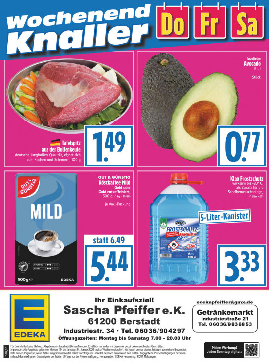 Bitte beachten Sie, dass dieser Text automatisch generiert wird und möglicherweise Fehler enthältenend el woch fi] i u ld Kna fa a RS on Ÿ nl à 1 x —_—— ER MILD FROSTSCHUTZZ | ISG TI | statt 6.49 BI | LEE 5000 ml (X LID I 500g @ EDEKA ® Ihr Einkaufsziel! [email protected] Sascha Pfeiffer e.K. Getränkemarkt Industriestraße 21 61200 Berstadt Tel. 060 36/983 68 53 Industriestr. 34 - Tel. 06036/904297 Öffnungszeiten: Montag bis Samstag 7.00 - 20.00 Uhr Für Druckfehler keine Haflung. Abgabe nur in haushaltsüblichen Mengen. Erhältlich nur in den mil diesem Angebot gekennzeichnelen Geschäften. BN Impressum: Alle Angebote gültig von Montag, 19. bs Samstag, 24. Januar 2026 (außer Wochanendknaller). Wir haben uns für diesen Zeitraum ausreichend bevorratet. Jeden Sonntag Meine Werbun EB Bitte entschuldigen Sie, wenn Artikel aufgrund unerwartet hoher Nachfrage im Einzelfall dennoch ausverkauft sein sollten. Angegebene Preisermäßigungen beziehen sich auf den niedrigsten Gesamtpreis der letzten 30 Tage vor der Preisermäßigurg. Herausgeber: EDEKA Hessenring, 34201 Melsungen.