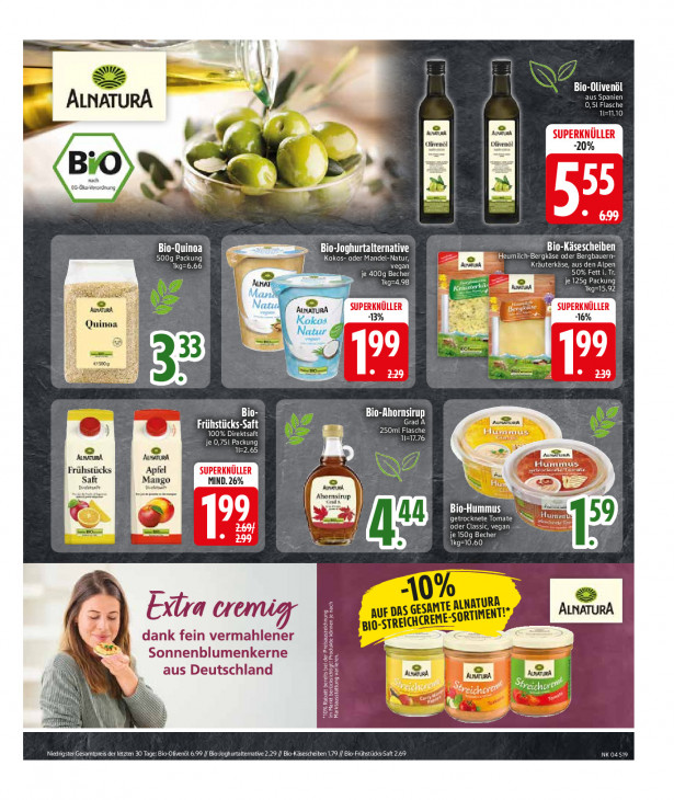 Bitte beachten Sie, dass dieser Text automatisch generiert wird und möglicherweise Fehler enthält— k CANTAL ALNATURA aus Spanien 0,51 Flasche 11.10 SUPERKNÜLLER fe Olivenöl 20% BiO nach "Cn nung, NE mn 5 EE Bio-Käsescheiben 500g Packung ER Heumilch-Bergkäse oder Bergbauern- 1kg=6.66 vegan Kräuterkäse, aus den Alpen 50% Fett i. Tr. je 4009 Becher je 125g Packung ‚Aunarı ne KEN kg=15.92 AUNATURA | SUPERKNÜLLER ne SUPERKNÜLLER a 13% 16% Quinoa = u 99 ha 99 zog kij U ee, lie Bio-Ahornsirup Grad A = LOTO OT 250ml Flasche 100% Direktsaft 11=17.76 je 0,751 Packung KE Ge H Frühstücks Apfel = beten Saft Mango Cr Ku Cy en A 5 Bio-Hummus Alten; 99 getrocknete Tomate 59 meng oder Classic, vegan . 299 SEE RUN 1kg=10.60 ALNATURA b a cremig dank fein vermahlener Sonnenblumenkerne N iM aus Deutschland Ir N EAN EN ea |) IN lil Éreichc Fu GE At If SS N TEEN LE ed ne Niedrigstef/Gesamtpreis der letzten 30 Ta venël 6.99 // Bio-loghurtaltemative 2.29 // Bio-Käsescheiben 1.79 // Bio-Frühstücks« 69 TUE