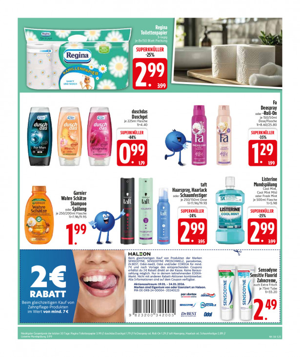 Bitte beachten Sie, dass dieser Text automatisch generiert wird und möglicherweise Fehler enthält= 2 ruins 8 kk ER eet PP 7 RE P- - wm mn SUPERKNÜLLER ina 25% nf SE ve I ® 2 1e OE ser 99 F 399 Fa Deospray duschdas oder -Roll-On Duschgel je 150/50ml je 225ml Flasche ‘re Dose/Flasche dus) 1154.40 11=8.60/25.80 FE Te SUPERKNÜLLER SUPERKNÜLLER 44% 35% DU ra PTT 5 en 484 k > Sum Listerine taft Mundspülung Haarspray, Haarlack Cool Mint, Garnier Cool Mint Mild Wahre Schätze a oder Schaumfestiger oder Fresh Mint tait je 250/150ml Dose \ EX / je 500ml Flasche Shampoo 1211.96/19.93 m 8 1125.98 LISTERII je 250/200ml Flasche oder Spülung vormen SUPERKNÜLLER SUPERKNÜLLER 117.96/9.95 24% COOL MINT 25% x == mason 99 E 99 @ me * 2 — Ze Danses aan din ensure ns HALZON Beim gleichzeitigen Kauf von Produkten der Marken SENSODYNE, SENSODYNE PROSCHMELZ, parodontax, | DrBEST, Odol-med3, Odol und/oder COREGA für mind. 7€ und nach Vorlage des entsprechenden Coupons Dl erhältst du 2€ Rabatt direkt an der Kasse. Keine Baraus- — Sensodyne zahlung möglich. Nur in deinem teilnehmenden EDEKA- Markt. Nicht mit anderen Rabatt-Aktionen kombinierbar. t Sensitiv Fluorid ü Alle Informationen sind auf dem Coupon verfügbar. E F Aktionszeitraum: 19.01. - 24.01.2026. auch Extra Frisch Zahncreme, 2€ Marken sind Eigentum von oder lizenziert an Haleon. mn PM-DE-DRB-24-00004 - 20240123 je 75ml Tube 11233.20 RABATT A parsdontax ant) Beim gleichzeitigen Kauf von smsoone / | fl SENSODY! Zahnpflege-Produkten 49 im Wert von mind. 7€ I | | II Dr. an nne anas 9 823200 342005 en nn EE manman sne ennn nn