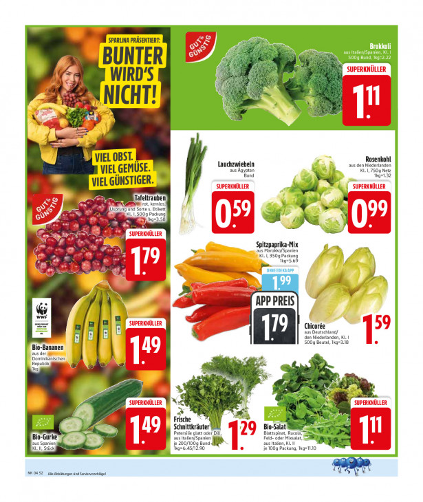 Bitte beachten Sie, dass dieser Text automatisch generiert wird und möglicherweise Fehler enthältSPARLINA PRÄSENTIERT: kN BUNTER zen, Mi, SUPERKNÜLLER WIRD'S n NICHT! x x VIEL OBST. Rosenkohl Lauchzwiebeln aus den Niederlanden VIEL GEMÜSE. aus Ägypten Kl. 1, 750g Netz Bund 1kg=1.32 VIEL GÜNSTIGER. SUPERKNÜLLER SUPERKNÜLLER ed, Tafeltrauben 22 & ue rot, kernlos À Pond D Usprung und Sorte s. E ett = « KL. 1, 500g Packung cor en Al 58, Sl Le Se SUPERKI LER Spitzpaprika-Mix 4 aus Marokko/Spanien vr ze KL. 1, 350g Packung 19 1kg=5.69 Ee APP PREIS Pe SUPERKNÜLLER Chicorée aus Deutschland/ den Niederlanden, KL | 500g Beutel, 1kg=3.18 1 Bio-Bananen aus der ul) Domini nischen Republik Ikg ie SUPERKNÜLLER Sn Ei SUPERKNÜLLER ed À Frische > Fi A Schnittkräute Bio-Salat ep” 1] Peter: 29 t, Rucola, be aus I /Spani latt oder Dill, Blattspi Feld- oder alat, = je 200/100g Bund aus Italien, Kl. II & s à 1kg=6.45/12.90 je 100g Packung, Ikg=T1.10 NK 0452 Alle Abbildungen sind Serviervorschlägel u