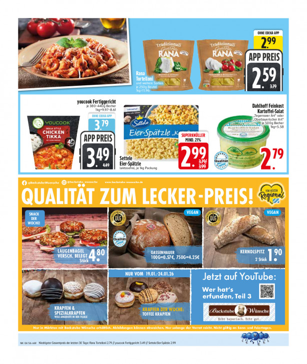 Bitte beachten Sie, dass dieser Text automatisch generiert wird und möglicherweise Fehler enthältOHNE EDEKA APP 2 299 4, N APP PREIS rrd, Rana N Tortelloni PTE TC à je 250g Beutel PERS ip, kg 96 youcook Fertiggericht je 380-440g Becher NAHE Dahlhoff Feinkost 1Kg=9.97-8.61 masse Kartoffel-Salat OHNE EDEKA APP T4 ‚Tegernseer Art" oder i Oberbayerischer Art 2 je 500g Becher 1kg=5.58 Al APP PREIS MIND. 21% 45 Le Ke 49 Settele > 2 Eier-Spätzle ali = ee laktosefreï, je Ikg Packung ee) Regional = à SNACK 2 LU cn VEGAN - DER me — D: Ë Lu re de ee Hess 2 Br br oh Ee eg > LAUGENBAGEL CSA KERNDLSPITZ VERSCH. BELEGT 1006=0.57€, 7506=4.25€ = ka 2 Stück 12 À el NUR VOM 19.01-24.01.26 D Jetzt auf YouTube . EN Wer hat’ k erfunden, Teil 3 led LE KRAPEEN-DER WOCHE: SPEZIALKRAPFEN TOFFÉE KRAPFEN CEE IS VIELE ANGEBOTE IN DER FILIALE INK 0456 mW Niedrigster Gesamtpreis der letzten 30 Tage: Rana Tortelloni 2.79 // youcook Fertiggericht 3.49 // Settele Eier-Spätzie 2.99
