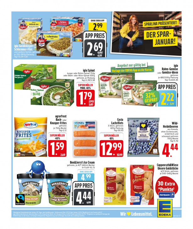 Bitte beachten Sie, dass dieser Text automatisch generiert wird und möglicherweise Fehler enthältFL ‘Lg A, Italiano ‚OHNE EDEKA APP u. 4 3° , Müllerin Art iglo a TIERT: 55 7 SPARLINA PRÄSEN => LE er PSE ee Pe Ee ri % ätBordelaise br APP PREIS DER SPAR- d, à JANUAR zj 6 — = pn iglo Rahm-Gemiise iglo y iglo Spinat ee oder Gemüse-Ideen Daken oder Blatt- oder Würz-Spinat 500g Junger oder Rahm-Spinat 7509 gefroren Dee a FZ za > gefroren, je Packung hs je 480/500g Packung Ze 1kg=2.39/3.58 1kg=4.63/4.44 iglo SUPERKNÜLLER ROSEN- MIND. 40% KOHL la, 7 APP PREIS Rahm-Spinat EN ur Es | KÈMIES 19 Ks BEMUSE on a. 5 agrarfrost Back- oder Costa Knusper-Frites ca Lachsfilets Li Wild- gefroren um 3 Stück, gefroren ae je 750g Beutel 420g Packung AT Heidelheeren aus Kanada, KNUSPER Tkg=2.12 1kg=30.93 2 Hz Kg) ohne Zuckerzusatz, 1 a % fo erntefrisch und SUPERKNÜLLER SUPERKNÜLLER 5 dad WIL DELEEEKEN schonend gefroren FRITES VE 40% 18% 4 750g Beutel 1kg=5.92 Zu FE) N is 5 ef 99 Fi EA fi me ie sl ns = GR e 1599 pe Ben&Jerry's Ice Cream Ad gefroren, je 42/-465ml Becher Coppenrath&Wiese 11=11.69-10.73 Unsere Goldstücke 6/9 Stück, gefroren je 300-540g Beutel LE 30 Extra APP PREIS in CE AAC _# 1 Le ef hannie | PAYBACK 98 TE > Chocolate 44 a » Ns) Judge Brownië, == = CES nas ) 5 EDEKA