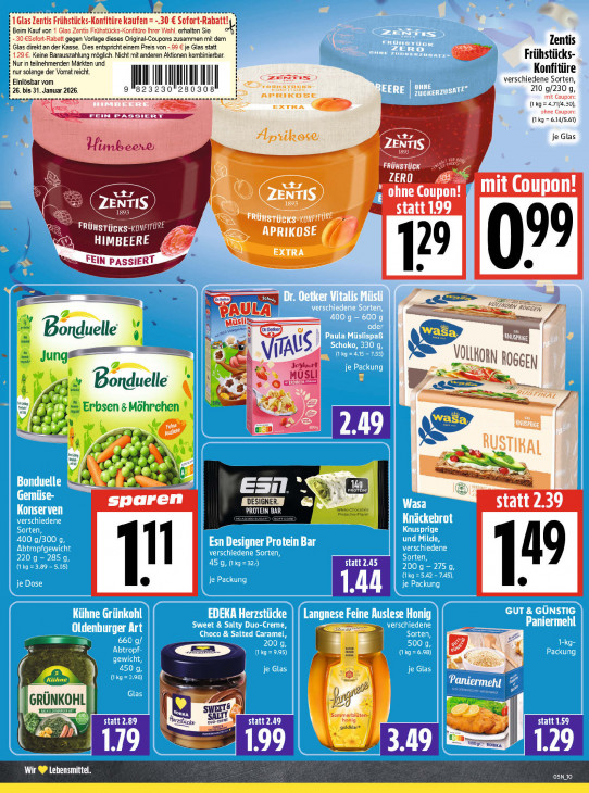 Bitte beachten Sie, dass dieser Text automatisch generiert wird und möglicherweise Fehler enthälteN Glas Zentis Frühstücks-Konfitüre kaufen = -.30 € Sofort-Rabatt! oA im Kauf von 1 Glas Zentis Frühstücks-Konfitüre Ihrer Wahl, erhalten Sie k las direkt an der Kasse. Dies entspricht einem Preis von -.99 € je Glas statt 0 ESofort-Rabatt gegen Vorlage dieses Original-Coupons zusammen mit dem ze Zentis 29€. Keine Barauszahlung möglich. Nicht mit anderen Aktionen kombinierbar. Frühstücks- lur in teilnehmenden Märkten und ır solange der Vorrat reicht. en Konfitüre inlösbar vom I | CES verschiedene Sorten, . bis 31. Januar 9 nl M | B0308 210 g/230 9, TRES > a ee eee mit Coupon: „ED (kg = 4.71/4.30), ohne Coupon: FEIN PASSIERT (1 kg = 614/561) je Glas Himbeere 1893 | FRÜHSTÜCI ZERO E hne Coupon! mit Coupon! U (ZENTIS) ha ELKA ST FRÜHSTÜCKS-KONFITÜRE À APRIKOSE DE HIMBEERE Ti ein PASSIERT 7 Hi En LE UEA maman Ian CT . Bonduelle RN > = EEE Er ie Vo LHORN Roggen rs > NE » Bord uelle #5 OF a 4 B en 1 " 3306" = EM à E Cl LE Le > 6 2.49 SAV En = Es paren PROTEIN BAR 5 statt 2.39 . de statt 2.45 1.44 Ee var Jonie = ij ni u GRUNKOHL Jo 0 . S0ExA SWEET, dr CAE) Slücke Du SAL 1% EA) Era r fs de Ji goldkiar®) 1.19 u [KL Wir ® Lebensmittel. DENE)