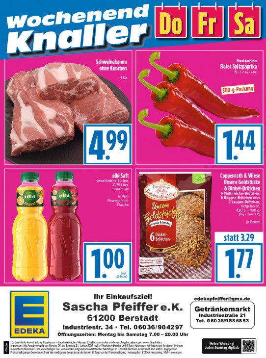 Bitte beachten Sie, dass dieser Text automatisch generiert wird und möglicherweise Fehler enthältenend woch ul m [LL Kna 0 nad a" RUE Tel albi Pb: | LINSE „AN ie Musee 4 IG L IL , OU LL SS 4 & kr. er Ji ver ar at Die | zel / Statt 3.29 I el vhs Se? ds : AR = (zul. > ral -25 Pfand) — = Ihr Einkaufsziel! [email protected] Sascha Pfeiffer e.K. Getränkemarkt Industriestraße 21 61200 Berstadt Tel. 060 36/983 68 53 Industriestr. 34 - Tel. 06036/904297 Öffnungszeiten: Montag bis Samstag 7.00 - 20.00 Uhr Für Druckfehler keine Haftung. Abgabe nur in haushaltsüblichen Mengen. Erhältlich nur in den mil diesem Angebol gekenrizeichnelen Geschäften. Impressum: Alle Angebote gültig von Montag, 26. bis Samstag, 31. Januar 2026 (außer Wochanendknaller und 6 Tage-Abräumer). Wir haben uns für diesen Zeitraum Meine Werbung! ausreichend bevorratet. Bitte entschuldigen Sie, wenn Artikel aufgrund unerwartet hoher Nachfrage im Einzelfall dennoch ausverkauft sein sollten. Angegebene Jeden Sonntag digital: B Preisermäßigungen beziehen sich auf den niedrigsten Gesamtpreis der letzten 30 Tage vor der Preisermäßigung. Herausgeber: EDEKA Hessenring, 34201 Melsungen.