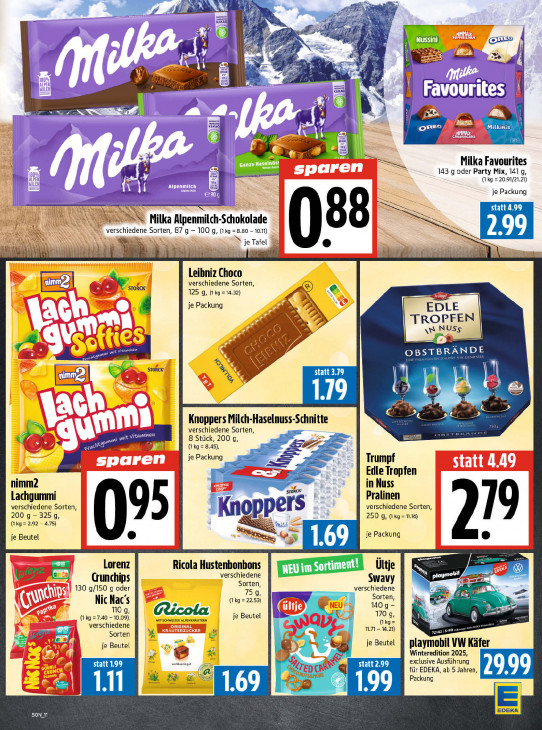 Bitte beachten Sie, dass dieser Text automatisch generiert wird und möglicherweise Fehler enthält+ Nussini ln ORE à =. mg Je | | 4 A ER D. 2 Ri wi rl © | À Milka Favourites té [2170 PN sparen 143 g oder Party Mix, 141g, hef (1kg = 20.91/21.21) je Packung 5 Milka Alpenmilch Schokolst e a =8.80 - 10.11) verschiedene Sorten, 87 g — 100 g, (1ka N Te > à je Tafel © AN >} ji) Leibniz Choco Pak Pr Bi verschiedene Sorten, 125 g, (ixg=14.22) je Packung © ] EDLE ROPFEN [| | ei N NUSs 7 OBS EE = Va up 2 al & NE er u) Knoppers Milch-Haselnuss-Schnitte verschiedene Sorten, 8 Stück, 200 g, Yo CR hak (kg = 8.45), 35 =, EEG ES = es je Packung mm Trumpf PEP} statt 4.49 Edle Tropfen nimm2 Pad in Nuss End STORCK Lachgummi I Pralinen verschiedene Sorten, pers verschiedene Sorten, 200 g— 325 9, Kn p (lkg= 2.92 — 4.75) 250 g, (tkg= 1116) je Beutel es je Packung ep Lorenz Ricola eee Ültje verschiedene NEU FR nut) RL’ Gunchips Swavy Ge 130 g/150 g oder Sorten, verschiedene 759, Sorten, Nic Nac’s (kg = 22.53) 140 g- € gar ie 110 g, (1kg =7.40 - 10.09), je Beutel 170 g, verschiedene CREME) 1.71 (kg 14.21) U Sorten Ee je Beutel je Beutel LS 1 playmobil VW Käfer d ® Winteredition 2025, D exclusive Ausführung “ für EDEKA, ab 5 Jahren, > Packung pe" KA SONT