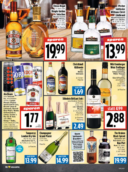 Bitte beachten Sie, dass dieser Text automatisch generiert wird und möglicherweise Fehler enthältu je Nr Pircher L 4 Li Chivas Regal 1 12 Jahre oder Südtiroler ki N Dimple Golden F © TLC ; > m Williams Christ we Selection Din ok le Blended Scotch ME Edelbrand | Whisky, Waldhimbeergeist MRE 40 % Vol AM oder Obstler, € A 38 %/40 % Vol 0,7 Liter, ge 0,7 Liter, a Liter = 28.56) (ILiter = 19.99) je Flasche Ì RL \ je Flasche à PIRCHE de edet 5 (f \ if | % À LL K es, ee 7 j [PIRCHER — II ij N, Bend 3 AMS 3 99 2 4 99 Ss 1 Christkindl Württemberger Glühwein Wein Trollinger oder Lemberger, sain,Morga Weißer Schwarzriesling, Glühwein su Müller Thurgau DN Dry cil oder Cid je 1-Liter- Süss & Fruchtig, Mt) ORIGINAE ON cin Flasche verschiedene | Er TE LTR Sorten Dei 0,75 Liter, (ri IN (i Liter = 3.84) (TE) statt 1.99 Es je Flasche ES Mr M Bea A EM | J & Fruchm © I 1.69 Jim Beam u oder Smirnoff Ice, verschiedene venen Sraa BOURBON Söhnlein Brillant Sekt WürT Sorten, Captain WerenecEne Sorten, Morgan Original HI | f 0,75 Liter, MBERGER Spiced Gold & Cola À (1 Liter = 3.32) Bacardi Limon & SÖHNLEIN oder Söhnlein RIES Lemonade, Bacardi Piccolo, hönrı Razz Mojito, Wodka SÖHNLEIN SOHNLEIN 2 x 0,2-Liter- Gorbatschow & Flaschen, Lemon, Gordon's Î (1 Liter = 6.23) rock Dry Gin & Tonic je Flasche/ oder effect so! EIN Packung Energy + Vodka, 1] 0,33 Liter/0,25 Liter, IN Gi gehe 88 (1 Liter = 5.36/7.08), (zzal teilweise koffeinhaltig, Je ® 25 Pfand) kl aan Einwegpfand-Dose 2.49 Tanqueray Champagner #? Unsere The Kraken À London Dry Gin Grand Plaisir Spirituosen- Black Spiced 431% Vol. oder 0,75 Liter, Broschüre - Spirituose auf Alkoholfrei 0,0 %, (1 Liter = 19,99) weitere hochwertige Rum Basis oder 0,7 Liter, (1 Liter =19.99) Spirituosen in Ihrem 10 Flasche Markt erhältlich Ron Piet ‚oder kurzfristig Rum, 10 Jahre auch je Flasche auf Bestellung! 40 % Vol ALKOHOL 0,7 Liter, Ten FREI PIET ee (1 Liter = 28.56) NN LET and KA IN je Flasche EAK) A statt 17.99 | Fe | | Il 13.99 14.99 III] 19.99 Wir % Lebensmittel SON IA W
