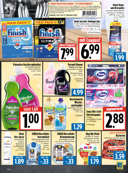 Bitte beachten Sie, dass dieser Text automatisch generiert wird und möglicherweise Fehler enthältid ji 2 finish Maxi Packs kaufen E = 2€ Sofort-Rabatt! -. finish Glanz- Beim Kauf von 2 finish Maxi Packs Ihrer Wahl, erhalten Sie 2 € Sofort-Rabatt gegen Vorlage dieses Original-Coupons zusammen mit den 2 Packungen direkt an der Kasse. Dies entspricht einem Prei und Klarspüler = von 6.99 € je Packung statt 7.99 € Kene Barauszahlung möglich. Nicht mit anderen Aktionen kombinierbar. Nur in teilnehmenden Markten und verhindert Wasserflecken DR) 1 nur solange der Vorrat reich. En a auf Geschirr & Gläsern, ı Einlösbar vom 8. bis 13. Dezember 2025. | | | I | 800 ml, (1 Liter = 2.49), lit aa ee nenne f 23200 562007 < Flasche PE pa 4 PS finish Geschirr-Reinigertabs für die Spülmaschine, verschiedene Sorten, 42 — 64 Waschladungen, En Eu mit Coupon: (1 WL = 11 17), ji ohne Coupon: (1 WL= --19) 4 je Maxi-Packung — inish Ki ERD mi SWERBZFLE CLASSIC = ren On TS mit Coupon! eo | ohne Coupon! N a. FETTLÖSEKRAFT N 2-F) 4 ® | = > sd en Ve Perwoll Renew Palmolive Geschirrspülmittel verschiedene Sorten, Flüssig oder Caps, 500 ml/750 ml, verschiedene Sorten, (i Liter =1.33/2.) ad. 19/27 Waschladungen, je Flasche mm (ML = -26/-18) je Flasche/ Packung Lis Rrwoll Rrwoll + DA nn ur 2 —r, c ee LEUR LS ib, nn Kuschelweich TX U Wäsche- ) ou ron) = Ï ra ET Te weichspüler molive LT verschiedene Sarten, statt 1.6 hel V2 38 Wäschen, sparen Kusc Kus he (1 WL= -.03) Zewa Ultra Soft wg FW IC ado Somer welt je Flasche Toilettenpapier Be 4-lagig, verschiedene Sorten, 8 x 150 Blatt E je Packung ® is GUT & GÜNSTIG Dove EDEKA Herzstücke EDEKA Herzstücke Hipp Bio Menü Batterien Deo-Spray Katzenmilch Katzennahrung ab dem 12. Monat, verschiedene Ergänzungsfuttermittel verschiedene Sorten, verschiedene Sorten, AAA Micro nn Mignon A4 für Katzen ab der 250 g, (1 ko =7.16), (ausgenommen Sorten, 6. Lebens- (kg = 3.30) je ea je Herz-Schale Dove ‚Advanced Care En ES ES N JS und Zink-Komplex), 7 woche, original 150 ml, 200 ml 1 EDEKA ra LE (1 Liter = 12.60) (1 Liter = 1.65) (BIO) forzst je FEINE Sr ss I je Dose Packung res ER a EN aar Ep LEE pr So Sr : 200 mi € 5 E KA 50N 15