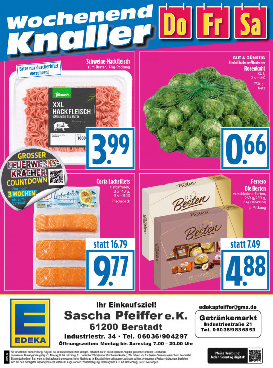 Bitte beachten Sie, dass dieser Text automatisch generiert wird und möglicherweise Fehler enthälte nend woch 11 DO uf A [LL Kna N = Tilmar’s es Er XXL RS 2 Le: HACKFLEISCH : Bu) NEL Gus ge = | 1000 F = à ru EUERWERKSS KRAC HE COUNTDOWN Æ ze 3 WOCHEN la file a # IR N RS = I: BE KLI DIE EEG statt 16.79 CS | h statt 749 chi A = u ® Ihr Einkaufsziel! [email protected] Sascha Pfeiffer e.K. Getränkemarkt Industriestraße 21 61200 Berstadt Tel. 060 36/983 68 53 Industriestr. 34 - Tel. 06036/904297 Öffnungszeiten: Montag bis Samstag 7.00 - 20.00 Uhr Impressum: Alle Angebote gültig von Montag, 8. bis Samstag, 13. Dezomber 2025 (au ter Wochenendkneller:. Wir haben uns für diesen Zeitraum ausreichend bevorratat. Für Druckfehler keine Haftung. Abgabe nur in haushaltsüblichen Mengen. Erhältlich nur in den mit diesen Angebot gekennzeichneten Geschäften. Meine Werbu Bitte entschuldigen Sie, wenn Artikel aufgrund unerwartet hoher Nachfrage im Einzelfall dennoch ausversauft sein sollten. Angegebene Preisermäßigungen beziehen Jeden Sonntag di al sich auf den niedrigsten Gesamtpreis der letzten 30 Tage vor der Preisermäf gung. Herausgeber: EDEKA Hessenring, 34201 Melsungen.
