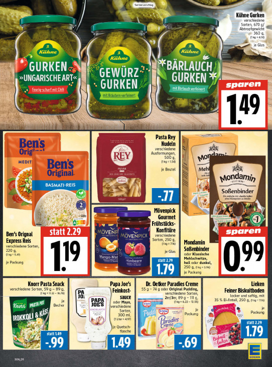 Bitte beachten Sie, dass dieser Text automatisch generiert wird und möglicherweise Fehler enthältAu A _ Kühne Gurken verschiedene ER Sorten, 670 g/ tn > Abtropfgewicht + LE ss = 2 360 q (1kg =4.14) ud je Glas PN Küh E AT No ED »UNGARISC ART< NT TE Na EEE mit Bärlauch verfeinert A trug % st Fo ES 149 it Pasta Rey Bens Nudeln verschiedene zn Orig’--' Ausformungen, a 9, MEDIT| (Ikg =1.54) Mo Bens a‘ je Beutel Mehl Original hell Sof} Fr ondamj; LTE À ” Á WIT EE Mondami In BASMATI-REIS Eingach zu kenne A LA (a QUE zy Fe Die einfache Art. dunkle Soßen el à ohne Klümpchen zu binden EE N « N m LS Müvenpick En A am 5 3 Nur 2209 Gourmet Soße n n dr k Ô: 4 Frühstücks- Kel em A Konfitüre Ben's Orignal OVENPICK verschiedene Sorten, 250 g Express Reis (Ikg = 716) Mondamin verschiedene Sorten Soßenbinder 220 g, Id Di je Glas oder Klassische (kg= 5.4) VEN 19 statt 2.79 Mehlschwitze, hell oder dunkel, 99 je Packung 250 g, (Ikg=3.96) 1.19 je Packung Knorr Pasta Snack Papa Joe's Dr. Oetker Paradies Creme Lieken verschiedene Sorten, 599 - 89g Feinkost. 55 g - 74 g oder Original Pudding, Feiner Biskuitboden (U kg = 11.12 - 16.78) verschiedene Sorten, locker und saftig, mit Jo. PAPA sauce 2er/3er, 89 g — 11 g, 35 Ei-Anteil, 250 g, (1 kg = 7.16) Becher JOES oder Mayo, Dr Detke} (kg = 6.22 — 12.55) verschiedene je Er 7 Sorten, [DrOetker) je Packung 300 ml, Packung (re EL (1 Liter = 4.97) radies Gr | je Quetsch- flasche statt 1.49 1.79 Se e RE -99 zn 1.49 69 50N_09