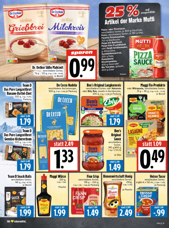 Bitte beachten Sie, dass dieser Text automatisch generiert wird und möglicherweise Fehler enthältvn. —— zu | Dr. Oetker, Dr Oetker, 072 = Artikel der Marke Mutti Mitchreis Pasta- oder Pizzasauce 2 400-g-Gtas/Dose, verschiedene run je 180-g-Glas, Pesto, verschiedene Sorten, ———. Passata Tomatenpüree, 700 -g-Glasflasche, Polpa mit EE M. UTTI D Polpa Fine-Fruchtfleis we oder Pelati En Elch ’ VOE me 5 400g-Dose, — Tomatenkonzentrat, | 200-9-Tube, Z Z EN Pomodorini = Kirschtomaten, 2: 5 er 400-g-Dose oder SA UC L Bio Tomaten, gehackt, 4 >. er Süße Mahlzeit Z N U vidi ded | verschiedene Sorten, 400-g-Dose AU 76 g - 125 g, (1kg =7.92 -13.03), EE t9 Ng je EAS 1} had LR La oe) Team D De Cecco Nudeln Ben's Original Langkornreis Maggi Fix-Produkte verschiedene Sorten oder Naturreis Das Pure Langzeitbrot verschiedene Ausformungen, oder Würzpaste, verschiedene Sorten, 500 g, (1 kg = 2.66), je Packung oder Ebly Reis, jeweils in Kochbeuteln, 23 g — 85 g, (1kg = 5.76 — 21.30), Banane-Dattel-Zimt | 500 g, à LE =3.58), je Packung ar je Beutel 300 g, (1kg =5.97), ij 5] f A acung | AA “Bens Ea CE as] Ty WÜRZPASTE Original. (AT, Ex) in Lx oO: EE TEE statt 2.59 X 1.19 a Ae IN CT LUE Le RG | en 1 L; EAN Team D Ben's | Î Ad 1 CUT it somgngerüten Taten ir Das Pure Langzeithrot ° DELELLO Original Gemüse-Kichererbsen — Sauce kj + enen verschiedene 300 g, (1kg =5.97), 1 Lina a PRISE Packung Sorten, | 395 g/400 g Original (ko = 3.77/3.73) RS el KEN id BAE je Glas statt 249 Er EEN S 33 statt 2.59 En 1.79 LEN Team D Snack Balls Maggi Würze Finn Crisp Bienenwirtschaft Honig Heisse Tasse verschiedene Sorten, 250 9, verschiedene Sorten, verschiedene Sorten, verschiedene Sorten, (1kg =796) ikk Ee 250g, 145 9, (Ikg= 33.74,) 195 9 - 200g, -) {kg = 9.96) ergibt 4 x 150 mi, (1 Liter = 1.65), je Beutel Flasche {kg =7.45 - 7.64), je Packung je Packung nee nor LE) | | je Flasche CE Heisse TA SNACK DD ORIGINAL grasse (AS # statt 2.49 statt 2.49 hl statt 1.99 Sy statt 2.99 statt 1.39 199 1.49 2.49 99 199 | I ZUR CARPE"