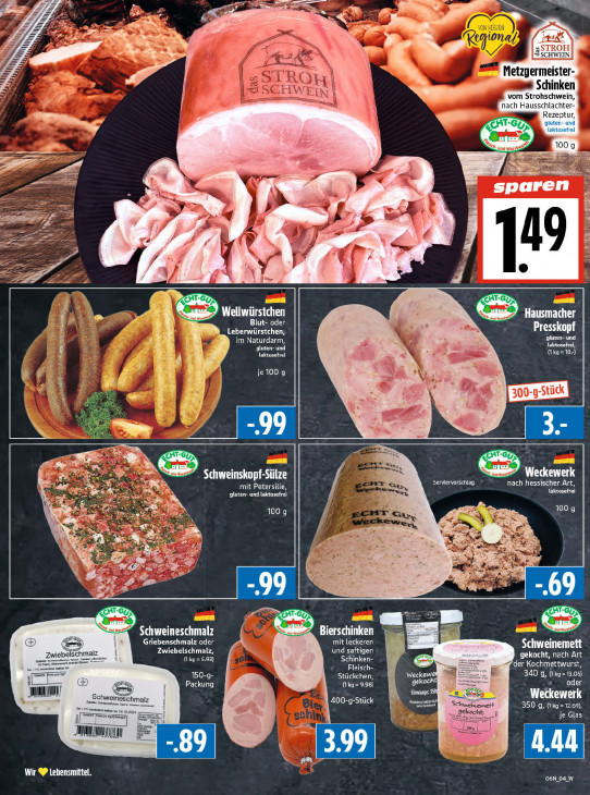 Bitte beachten Sie, dass dieser Text automatisch generiert wird und möglicherweise Fehler enthältel a SS rn À SN TRO, me a 1] RO Metzgermeister- N Schinken WE IN vom Strohschwein (! nach Hausschlachter- Rezeptur, ie. "7 Pr NK 100g — PE "28 ie I < sparen x AT ss , a Ns En Js Fi > == Wellwürstchen ER Hausmacher Blut- oder Leberwürstchen, Presskopf gluten- und à im Naturdarm, laktosefrei, | gluten- und laktosefrei (ka=10-) | | 8 s ki je 100 g à = F BE Pr 30 ck har W te ae en Nen + Su, er Weckewerk Ne) Schweinskopf-Sülze Servervorsentag nach hessischer Art, mit Petersilie Su laktosefrei gluten- und laktosefrei ar 100 g N 100 g € à HE N I A il 0, Ss | % u 5 An > #3 L > Schweineschmalz Cire) Bierschinken 7 Griebenschmalz oder AE) 8 Schweinemett Zwiebel hmal Zwiebelschmalz, und saftigen (kg =5,93) Schinken- arte, En = der Kochmettwurst, gekocht, nach Art Fleisch- 150-g- à Stückchen, Weckew 340 g, (Ikg=13.06) Ho, Packung (CELL) gekochi 5 oder am) Schwe Einwaage: 350 Wetkewerk masseer Spe hmalz 400-g-Stück ssd A) Schwe wett 350 g, (Ikg= 12.69) je Glas UM Wir CU O6N_OAW