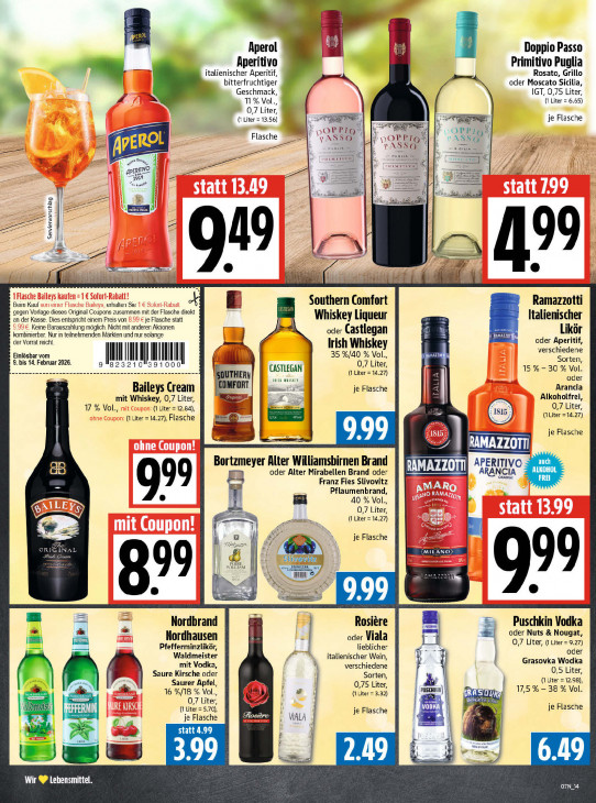 Bitte beachten Sie, dass dieser Text automatisch generiert wird und möglicherweise Fehler enthältKf | * 2 ae = Aperol Doppio Passo Aperitivo Primitivo Puglia italienischer Aperitif, Rosato, Grillo Fi. bitterfruchtiger oder Moscato Sicilia, Geschmack, IGT, 0,75 Liter, I fs 11% Vol. (I Liter = 6.65) 0,7 Liter, ns (1 Liter = 13.56) je Flasche f en Flasche ort vA 8 opp 1Q # To . vOPPIG“ va oO vai v \SSO % ee * sl, En = | gpERITNO Ee =. m se === > 2 | > as a | 99 \ À EE. na À a == = Southern Comfort Ramazzotti Beim Kaul erhalten Sie Te as gegen Vorlage dieses Original Coupons zusammen mit der Flasche direkt Whiskey Liqueur Italienischer an der Kasse. Dies entspricht einem Preis von je Flasche statt Keine Barauszahlung möglich. Nicht mit anderen Aktionen oder Castlegan [ Likör der Vorrat reicht. kombinierbar. Nur in teilnehmenden Märkten und nur solange u i oder Aperitif, Irish Whiskey verschiedene Einlösbar vom r I IN I Il) 35 %/40 % Vol., is 14. Feb: ruar 2026. | 3210 39100 | A. 0,7 Liter, 4 : Sorten, ene an u u en er CASTLEGAN {1 Liter = 14.27) 15% - 30 % Vol. JUTHERN inısn wuiskit oder COMFORT an Arancia Baileys Cream je Flasche E mit Whiskey, 0,7 Liter, Alkoholfrei, 17 % Vol, (1 Liter = 12.84), 0,7 Liter, (1 Liter = 14.27), Flasche (Liter =14.27) hr, je Flasche de Bortzmeyer Alter Williamsbirnen Brand PER ITIVO auch oder Alter Mirabellen Brand oder ENA A RANCIA ALKOHOL Franz Fies Slivovitz IA FREI Pflaumenbrand, NU Vite 992 à 40 % Vol. 0,7 Liter, en == me (1 Liter = 14.27) £ Pr Sp je Flasche a Í N K MILANO) | FOIRE 3 ii I w | ne 7 99 nm > A 82° [4 ie | Ep Nordbrand Rosière Ps Puschkin Vodka > ä oder Nuts & Nougat, Nordhausen oder Viala Pfefferminzlikör, lieblicher | O,7 Liter, (1 Liter = 9.27) Waldmeister 4 italienischer Wein, h oder mit Vodka, verschiedene Grasovka Wodka Saure Kirsche oder 0,5 Liter, Sorten, (1 Liter = 12.98), Saurer Apfel, 0,75 Liter, Pusch gm 16 %/18 % Vol., (1 Liter = 3.32) 17,5 % — 38 % Vol. 0,7 Liter, arm 7 En nt al) (1 Liter = 5.70), je Flasche ln je Flasche je Flasche eo I VALA La la B DRS a statt 4.99 | | = EX 2.49 6.49 Wir © Lebensmittel. CAES