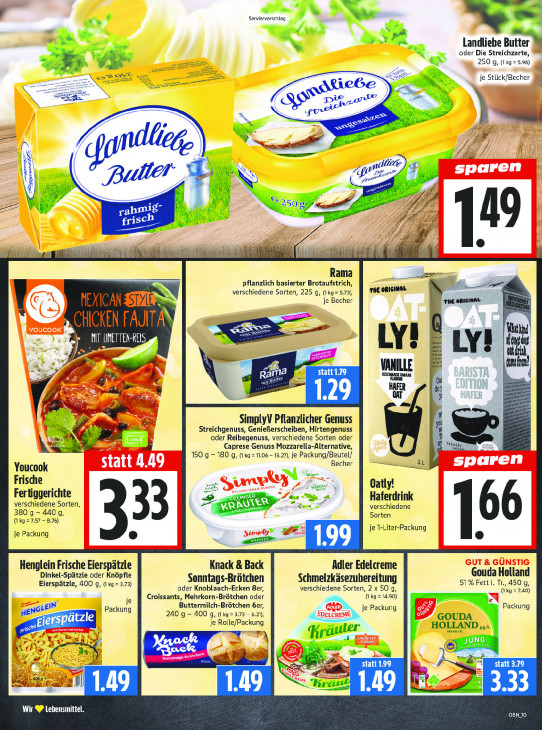 Bitte beachten Sie, dass dieser Text automatisch generiert wird und möglicherweise Fehler enthält€ m I I 2» cs à g. AS en 77 à Landliebe Butter Kr Le x oder Die Streichzarte, 4 “eq 250 g, (1kg = 5.96) Ke je Stück/Becher nn: nr NS eN Se Cs | Ne il Dark | Buter M ee: rah: rte A ou sch BEE: ir EVER 2 Rama . \ pflanzlich basierter Brotaufstrich, THE ORIGINAL verschiedene Sorten, 225 g, (Ikg= 5.73), NEXICAN ST) je Becher THE ORIGINAL KUENEN kid al a0 LD I Ly! LY! VANILLE ndi EE GESCHAACK SMAAK mL FAO a « HAFER 1.29 (A mn, en 4 SimplyV Pflanzlicher Genuss Streichgenuss, Genießerscheiben, Hirtengenuss ea (EEE oder Reibegenuss, verschiedene Sorten oder Totayıy Caprese Genuss Mozzarella-Alternative, san, 150 9 - 180 g, (1ko = 11.06-13.27), je Packung/Beutel/ lt Youcook Becher == Frische SE FRE Se Y Oatly! Ferüggerichte De x" Jaa verschiedene Sorten, Cn Haferdrink 380 g — 440 g, we a AGTER a Le verschiedene (1 kg =7.57 - 8.76) Sorten ZUR je 1-Liter-Packung je Packung ® [166 Eh Henglein Frische Eierspätzle Knack & Back Adler Edelcreme Gouda Holland Dinkel-Spätzle oder Knöpfle Sonntags-Brötchen Schmelzkäsezubereitung Eierspätzle, 400 g, (1 kg = 3.73) oder Knoblauch-Ecken 8er, 51% Fett i. Tr, 450 g, (kg =7.40) Croissants, Mehrkorn-Brötchen oder verschiedene Sorten, 2x 50 g, {1 kg = 14.90) Buttermilch-Brôtchen 6er, Packung HENS LEIN) du 240 g — 400 g, (kg =3.73- 6.21), je Packung AU rspätzle je Rolle/Packung EN GOUDA Pr HOLLAND ‚a are 7. Kräuter Vas a As Fe »- 78 ge statt 199 statt 3.79 I | he ) 1.49 149 hrauk 149 3.33 Wir ® Lebensmittel. OBN_10