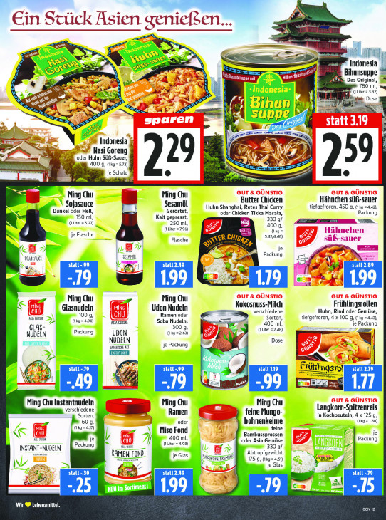 Bitte beachten Sie, dass dieser Text automatisch generiert wird und möglicherweise Fehler enthältnn Pd Ein Stück Asien genielZen… Ea ge. es mam N ar ns RR FF Fi N DS DE NX nt Indonesia COS si 55 EST CA > = À Pe EC ii Bihunsuppe a 2 aks Gasruielsuppe Ey’ | | > Das Original, À Me. sr | 780 ml, & ER STEN | | ce (I Liter 3.32) NS >> a | Dose ANS \ x Se Ir vi ART > Pz B TU ES 4 5 _— J ‚Pi paren statt 3.19 70 il ES 2 rd Indonesia & ID >> Pan Wi Nasi Goreng # | | 2 oder Huhn Süß-Sauer, lu.» 4 400 g, (ikg=5.73) Un dr ul LL à ES ET LEE Er Rt je Schale! GUT & GÜNSTIG GUT & GÜNSTIG Ming Chu Ming Chu Butter Chicken Hähnchen süß-sauer Sojasauce Sesamöl tiefgefroren, A50 g, (1kg =4.42), Dunkel oder Hell, Geröstet, Huhn Shanghai, Rotes Thai Curry 150 ml, Kalt gepresst, oder Chicken Tikka Masala, Packung (1 Liter = 5.27) 330 g/ ZEN 250 ml, 400 g, (Liter = 7.96) (Ikg= Hähnchen je Flasche 5.42/4.48) Flasche % 7 vir je 5 ü ß-sauer RE “| g Packung SUJASAUCE SE ÿ AMOL pre statt -.99 statt 2.49 statt 2.89 GS JK N 19 199 LA 99 GUT & GÜNSTIG GUT & GÜNSTIG Ming Chu Ming Chu Glasnudeln Udon Nudeln d Kokos nuss-Milch Frühlingsrollen = verschiedene Huhn, Rind oder Gemüse, ASIA CURIE 100 g, Ramen oder Æ = Sorten, tiefgefroren, 4 x 100 g, (1kg = 4.43), {kg = 4.90) ASIA CUISINE Soba Nudeln, 400 ml, GLAS- — 300 9, (1 Liter = 2.48) je Packung NUDELN Packung UDON (1 kg = 2.63) NUDELN Dose je Packung JAPANISCHE AT EEE Ir m Fr (ri % statt -.79 statt -.99 statt 1.19 Er Ingsro) -19 19 - 99 Ming Chu Instantnudeln an Ming Chu Ming Chu GUT & GÜNSTIG verschiedene C1 Langkorn-Spitzenreis Ramen feine Mungo- in Kochbeuteln, 4 x 125 g, Sorten, (kg =1.50) Fr 60 g, oder bohnenkeime | (kg = 417) Miso Fond 1} feine \ Bambussprossen je ÉTEINT je 400 ml, ij 7 oder Asia Gemüse Packung Packung ASIA COIN (1 Liter = 4.98) 330 g/ INSTANT-NUDELN ‘asana Abtropfgewicht RAMEN FOND je Glas Anne 775 g, (1kg=4.51) je Glas statt 30 statt 2.49 Genk) P. -19 15 25 199 a Wir ® Lebensmittel. O8N 12