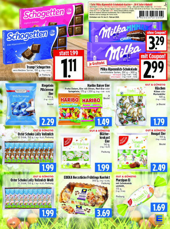 Bitte beachten Sie, dass dieser Text automatisch generiert wird und möglicherweise Fehler enthältBeim Kauf 250 g — 300 g Ihrer Wahl, erhalten Sie Re Preis von ‚ogen Vorlage diesos Original Coupons zusammen mit dor Tal direkt an der Kasso. Dies ontspricht einem je Tafel statt Keine Barauszahlung möglich. — Nicht mit anderen Aktionen kombinierbar. Nur in teilnehmenden Markten und nur solange der Vorrat reicht. | I III Il u Einlösbar vom 16. bis 21. Februar 2026. ‚m 23230 270 —— zen Vu = ad Za as | tten n AL 10 Sag Schoge R M ORES | (TUE CT [uit ta 29 EN B Hi ALPEN ; LI Er} KERN 1] Trumpf Schogetten 1 Milka Mon „Schokolade | J verschiedene Sorten, 100 g, (1kg = 1110) verschiedene Sorten, 250 g — 300 g, À u je Packung (kg = 9.97 - 1.96), à) (kg 10.97 - 13.16) 299 Riegelein Haribo Baiser Eier 7 Milchreme Frohe Ostern, Eier mit Ohren, Perl-Eier oder Häschen Spiegeleier, 175 g - 200 g, (1kg= 7.45 - 8.51) Häschen Küken oder = Eier Marienkäfer Milchcreme 150g, je 100 g, Eier (1 kg =15.27) AMD f Beutel (1 kg = 17.90) D. u ceert A Ch u Beutel Baısenikıer A y. je Beutel Fe LE En: 0: Kd AN 5 I à Ee LA f SA Zu N ee re = EX] + 4 Blätter- = Oster Schoko Lolly Vollmilch Nougat Eier 10 Stück, 150 q, (1 kg =13.27), Packung krokant (kg = 16.60) 150 g, r Eier Sie A Ef Blättörkrokant À Neugat | Beutel N Bahr 150g, Lier LIEr {kg = 13.27) D P ) A A, Packung Td TA — go TR & $ I 6 EN & Kn R % © 5 j © El di @) | E SAN eu qut ae u & KE rt en EDEKA Herzstücke Frühlings Konfekt Oster Schoko Lolly Vollmilch Weiß 300 g, (1kg =12.30), Marzipan Ei 10 Stück, 150 g, (kg =13.27), Packung Packung mit Schokoalde / ee … umhüllt, Es 175 9, sc 2 æ (kg = 9.66) NS 87, | rip Lg y Packung ia ae GES AN Sy à | © CCR ol Fe =P EME ET SA SAB, @ er N 7 £ 5 Sr Ÿ + D Zil T ge ww NW, yi (1 LE x à E \ R N pri à AN AN a 1e si 4) : À