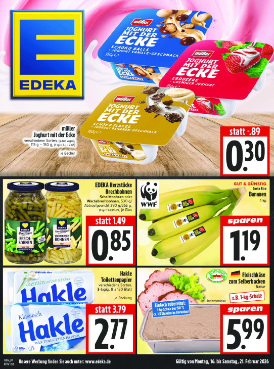 Bitte beachten Sie, dass dieser Text automatisch generiert wird und möglicherweise Fehler enthält= JOGHU, 2 Eef DE, 216 > 2 LR SCHO, (4 ELL A GALI VS VANILLE- GESCHMACK ZZ Be Sy Rn LR ST A a Le = 1 7 2: 7 miller 2 Joghurt mit der Ecke À verschiedene Sorten, (außer vegan), en ER 1 g - 150 g, (Ikg= 2.- - 2.65) er ES # AN KH , je Becher DO EURE Pa EN 30 N Dt EDEKA Herzstücke °e Costa Rica Brechbohnen # Bananen Schnittbohnen oder pr) Wachsbrechbohnen, 530 g/ É 1kg Abtropfgewicht 290 g/265 g, WWF DE CS Gkg=2.93/3.21, je Glas \ 5 CAS f} | CS Herzst Herzstäcke WACHSBRECH- À, BRECH- 7) À BOHNEN SEMRFEN LEN À IN 85 19 LS 1 Br hr u er Lullen Hakle BER Fleischkäse Pin ar Duft &Dekor verschiedene Sorten, Toilettenpapier ER : zum Selberbacken 3-lagig, 8 x 150 Blatt B Natur ld je Packung 3 Serviervorschtag — — Einfach zubereitet: — — — nl LOU TILL ca.1,5 Stund: en im Backofen! Klassisch le PAPIER TUE 1 m 99 DAS TOILE Lee G\ O8N 01 Unsere Werbung finden Sie auch unter: www.edeka.de Gültig von Montag, 16. bis Samstag, 21. Februar 2026 KW 08