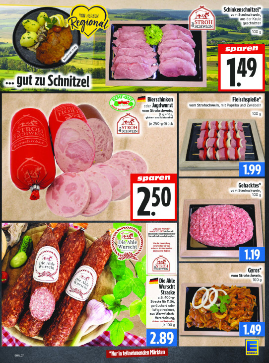 Bitte beachten Sie, dass dieser Text automatisch generiert wird und möglicherweise Fehler enthältSchinkenschnitzel* vom Strohschwein, in aus der Keule geschnitten ‚Re RN! A vs mg 3 4 = men S |! | 23 19 Te ch el an zus ht df nitz e= sd = B Bierschinken Fleischspieße* oder Jagdwurst vom Strohschwein, mit Paprika und Zwiebeln vom Strohschwein, (1 kg = 10), 100 g gluten- und laktosefrei je 250-g-Stück 8 SR ws Fi | == | N 199 Gehacktes* vom Strohschwein, 100 g 250 LA stellen wir ausschließlich in traditioneller iS: > Warmfeischverarbeitung her. 4 à Ke “A € A Die an t 7 A pi Ay, hle | W u chi S SCHWEIN Gyros* % Ty vom Strohschwein, w | Di se Die Ahle 100g je 4 Vars A W N Wurscht WT MEE ee AG Stracke ne z.B. 400-g- 4 BY #/| } Stracke für 11.56, > geräuchert oder PR luftgetrocknet, er Af aus Warmfleisch- Vera rbeitu! ng, #04 je 100 a 27 di 4 a 49 Ws “ 289 OBN_07