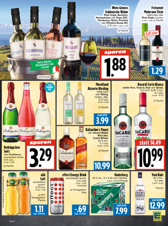 Bitte beachten Sie, dass dieser Text automatisch generiert wird und möglicherweise Fehler enthält| Wein-Genuss Freixenet Italienische Weine Mederano Tinto Pinot Grigio, Bardolino, halbtrocken oder Montepulciano oder Soave DOC, Pinot Grigio, trocken, Chardonnay, Merlot, Primitivo (1 Liter = 5.16), je Flasche oder Primitivo Rosato IGT, [Al 0,75 Liter, (1 Liter = 2.51) \| IN ij je Flasche ja Li | fi \ Lu LA où @Ë CHARDONNAY ET or MEDERANO TREVENEZIE cken = verni LLEM alu 2 = Diest WOCHE: & ANTILLEN Aus ee LU Rie a = se — 88 kl mn = |— FT — NA 1.29 Serviervorschlag he L 1 & | zij © ET Moselland Bacardi Carta Blanca ALKOHOL { j — | FREI : Akzente Riesling weißer Rum, Tropical, Razz oder Spiced, halbtrocken 37,5 %/27 4/3 5 % Vol, ] == oder Elbling, 0,7 Liter, I (1 Liter = 15.70) trocken, QbA, 0,75 Liter, je Flasche Akcente (I Liter = 5.32) Í ) Aer Fr je Flasche statt 4.99 ey \ Zur NL, 5 : Ballantine's Finest Elta ppcher oder Johnnie Walker Belkeppehe wa | 4 Zul Red Label, BACARDI BACARDI CARTA BLANCA Scotch Whisky, ee Ay 40 % Vol., + SUPERIOR Wi Lee) (1 Liter =15.70) 0,7 Liter, An A Rotkäppchen Sekt je Flasche oder Fruchtsecco, Plantes el Buecioo Ei verschiedene Sorten, (1 Liter = 4.39) 0,75 Liter, je Flasche 32 nn 10% 10.99 m Fi albi effect Energy Drink Underberg Yeni Raki verschiedene Sorten, 44 % Vol., 12 x 0,02-Liter-Flaschen 1 45 % Vol. Saft ali verschiedene 0,33 Liter, (I Liter = 33.29), Packung (1 Liter = 18.56) 0,7 Liter, Li Sorten”, (1 Liter = 2.09), En 0,75 Liter, koffeinhaltig Flasche (1 Liter = 148) je Einwegpfand- RZ an Dose TT tree “ 4 je PET- N k h k Einwegpfand- 4 ne Flasche I statt 18.99 FE high quais statt 999 *2.B. Orangensaft aus Orangensaftkonzentrat energy drink x 12.99 [Al AL muy 199 Js (zzgl. -.25 Pfand) (zzgl. -.25 Pfand) CEE