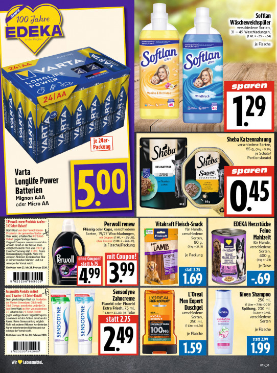 Bitte beachten Sie, dass dieser Text automatisch generiert wird und möglicherweise Fehler enthältLS Softlan 00 Jahre Wäscheweichspüler verschiedene Sorten, 31 — 45 Waschladungen, EDEKA (1 WL=-.03 - -.04) Ie heit je Flasche = ur N = So" PE << = «= — il ee à = © 2 pe É N >) Bd a N 29 4 bd KAAR 2 At rs 5 3 ji Le 4 Sheha Katzennahrung 7 verschiedene Sorten, 1 | 1 ge 85 g, (Ikg=5.29), je Schale/ sé. Portionsbeutel DELIKATESSE sé Varta auch, COLLECTION Longlife Power Batterien Mignon AAA 859 0) oder Micro AA 859 48 Perwoll renew Vitakraft Fleisch-Snack EDEKA Herzstücke Beim Kauf Flüssig oder Caps, verschiedene = für Hunde, Feine Ihrer Wahl, erhalten Sie k Sorten, 19/27 Waschladungen, verschiedene gegen Vorlage dieses (1WL= 2 (WL=-2 18) , Sorten, Mahlzeit Artikeln direkt an der Kasse. Dies Original Coupons zusammen mit den, 80 g, für Hunde, entspricht einem Preis von je je Flasche/Packung (1 kg = 21,3) De verschiedene Flasche/Packung statt Keine “LAMB Herzstäche Sorten, Barauszahlung möglich. Nicht mit Fu je Packung # 400 g, in teilnehmenden Markten und nur anderen Aktionen kombinierbar. Nur STRIPS _ MABLZEIT D RAGOUT MIT (Ixg= 1.73) solange der Vorrat reicht am MTTEL wen Einlösbar vom 23. bis 28. Februar 202 je Dose EUA) 99 Il Il 99 VS BA a 8 Il 3 56 85 In wt KL „69 Sensodyne 2 De LOREAL | L'Oreal Nivea Shampoo Beim gleichzeitigen Kauf von Zahncreme MEN EXPERT 250 ml, Fluorid oder Fluorid Men Expert (I Liter = 7.96) oder Ihrer Wahl Extra Frisch, 75 ml, Duschgel Spülung, 200 ml, erhalten Sie En (1 Liter = 33.20), je Tube NEUE, em verschiedene (1 Liter = 9.95), gegen Vorlage dieses Ongmat-Coupors zusammen mt den Artikeln direkt an der 1 ï Sorten, verschiedene Kasse. Keine Barauszahlung möglich. en Sorten ‚Nicht mit anderen Aktionen kombinierbar. à Pare EL MITTAURIN 250 ml, Nur ın teilnehmenden Märkten und nur (ILiter = 6.36) solange dor Vorrat reicht. u 00 EN je Flasche Einlösbar vom 23. bis 28. Februar 2026. SENSODYNE je Flasche | statt 2.99 19 ul All 159 199 TE Wir Lebensmittel. EN}